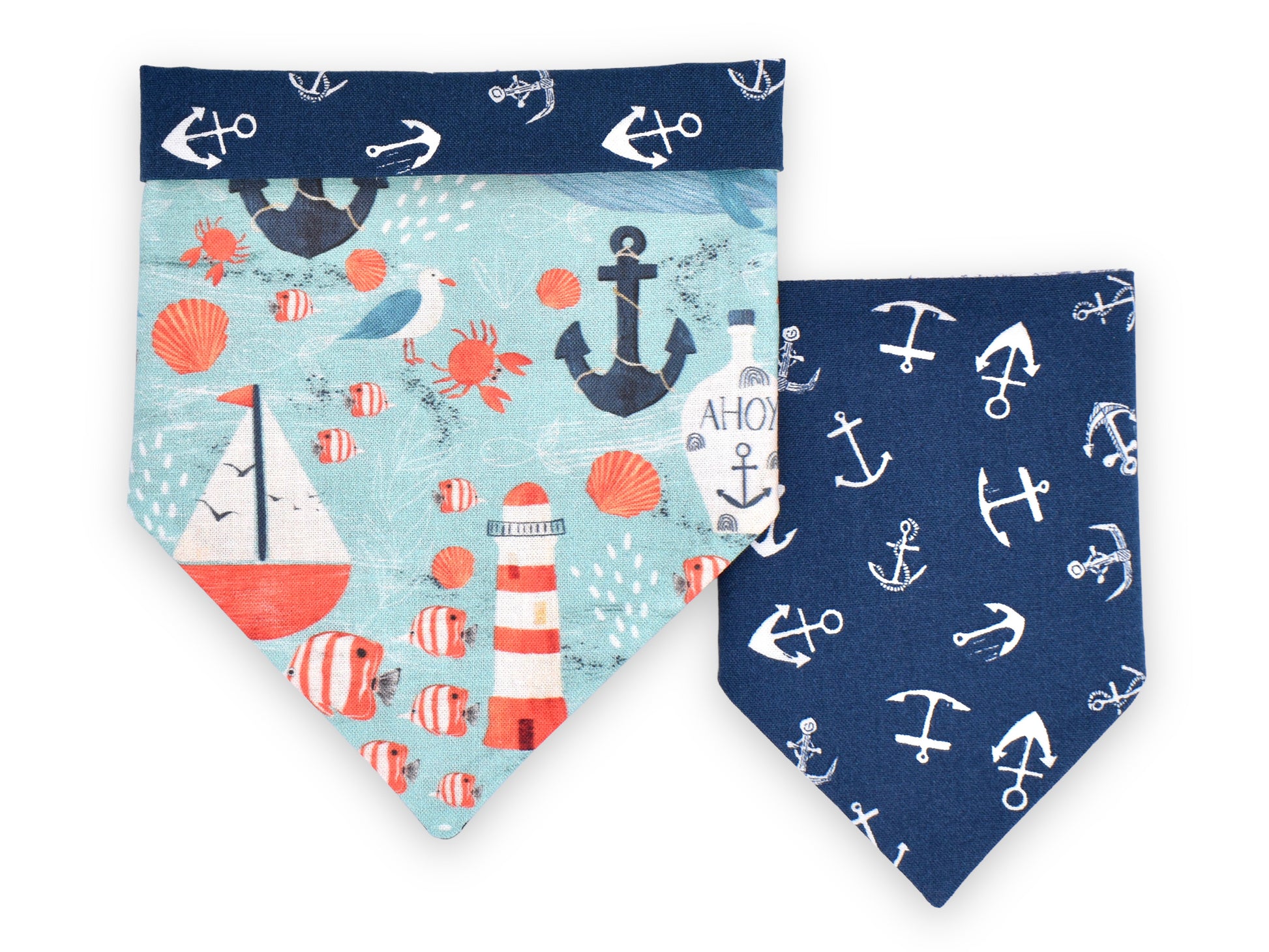 This style is dual-sided with a collar or theme-coordinated pattern on the reverse side, offering a two-for-one style option! This style can be worn by slipping your pet’s collar through the openings at the top of the bandana, and then clipping the collar around your pet’s neck. This style requires a collar for wear.