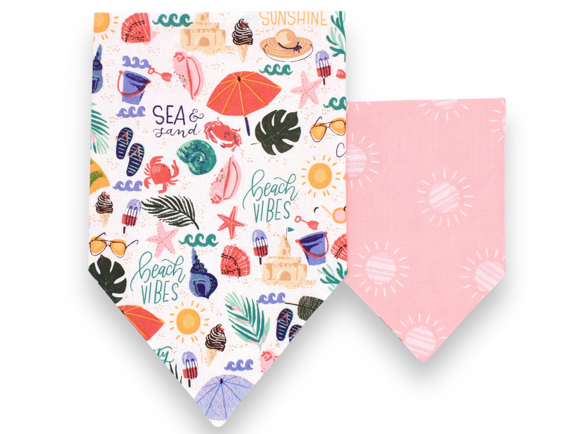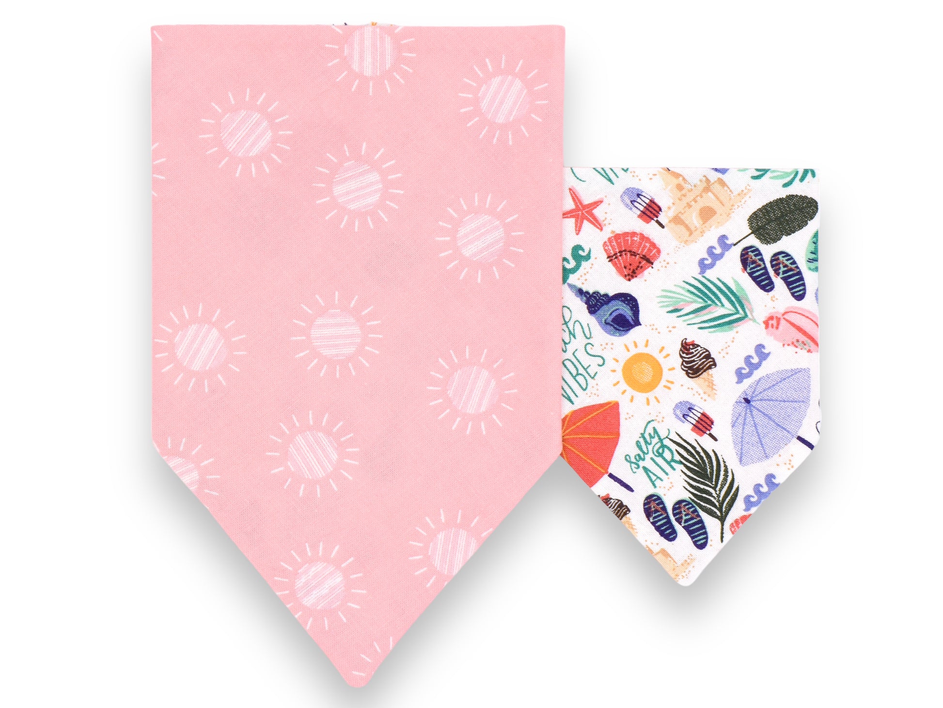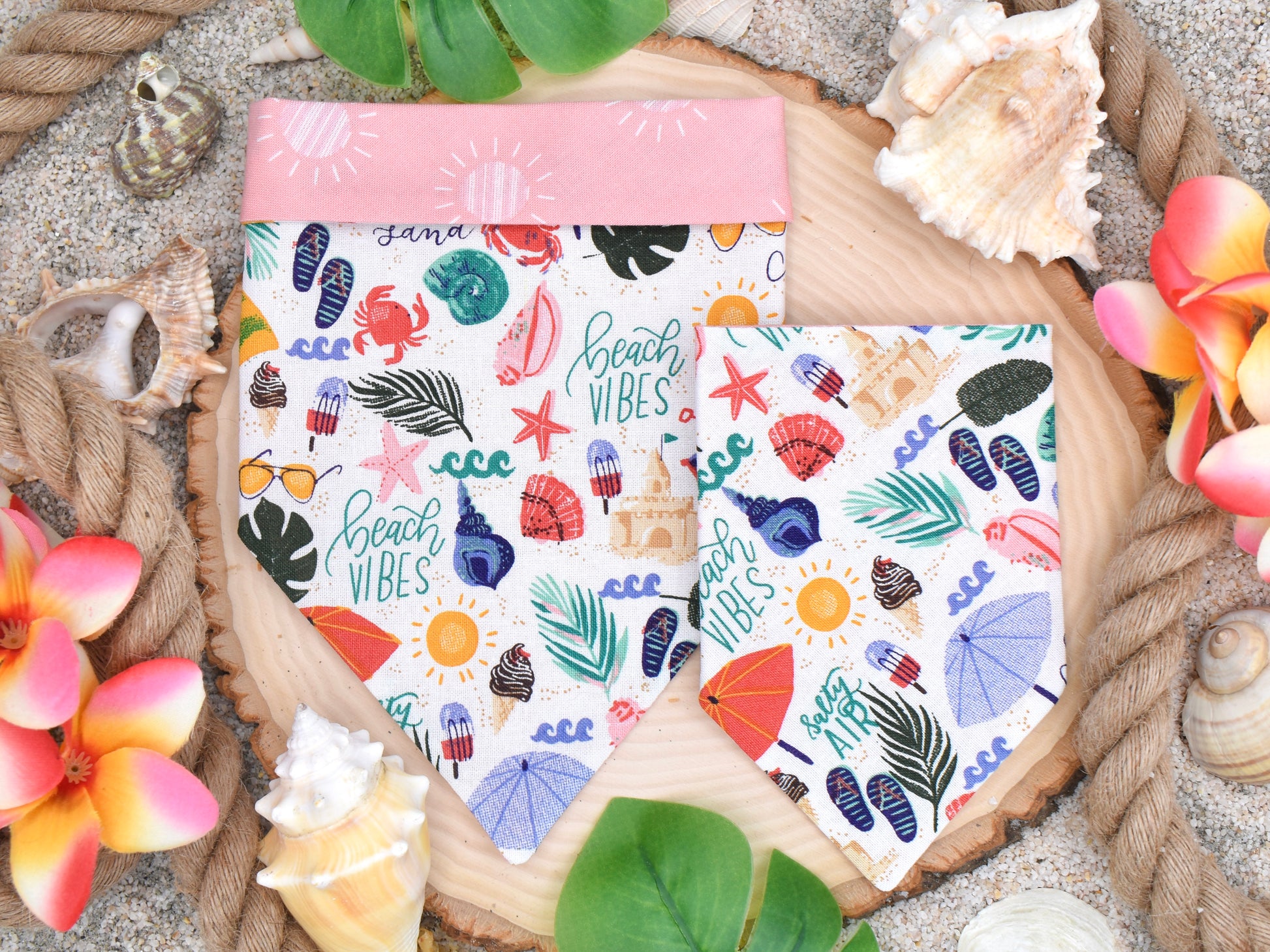 This style is dual-sided with a collar or theme-coordinated pattern on the reverse side, offering a two-for-one style option! This style can be worn by slipping your pet’s collar through the openings at the top of the bandana, and then clipping the collar around your pet’s neck. This style requires a collar for wear.