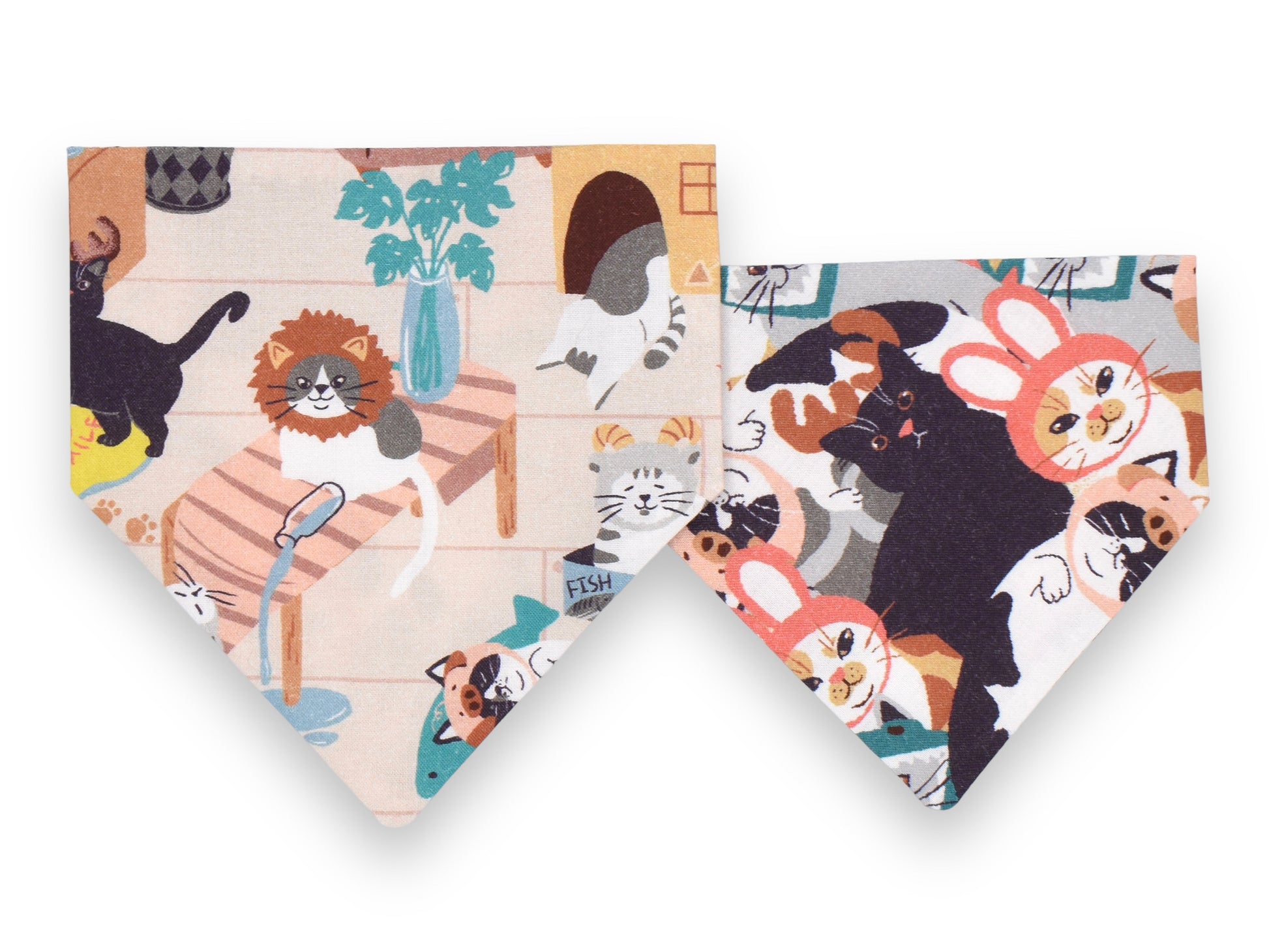 This style is dual-sided with a collar or theme-coordinated pattern on the reverse side, offering a two-for-one style option! This style can be worn by slipping your pet’s collar through the openings at the top of the bandana, and then clipping the collar around your pet’s neck. This style requires a collar for wear.