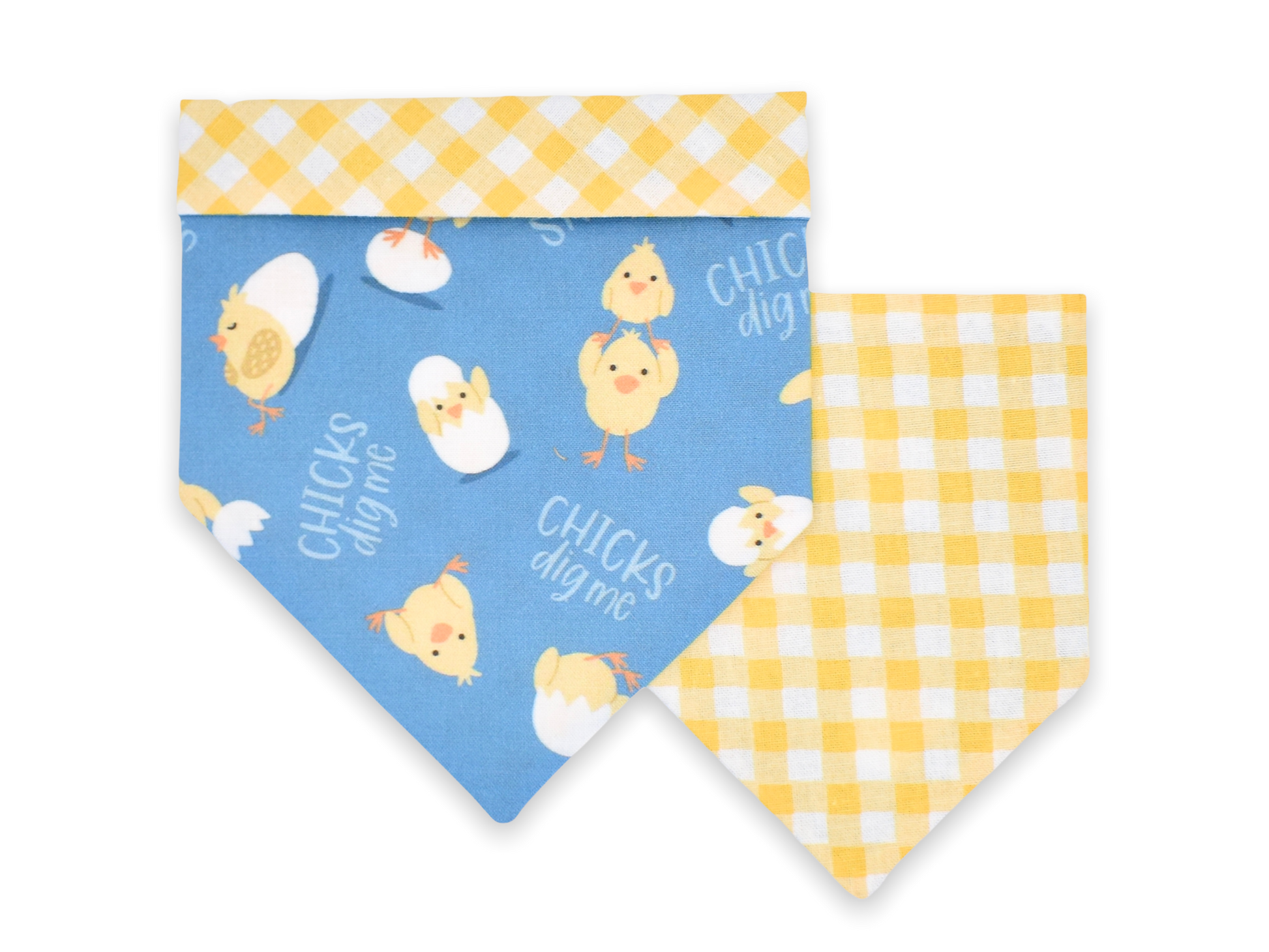 This style is dual-sided with a collar or theme-coordinated pattern on the reverse side, offering a two-for-one style option! This style can be worn by slipping your pet’s collar through the openings at the top of the bandana, and then clipping the collar around your pet’s neck. This style requires a collar for wear.