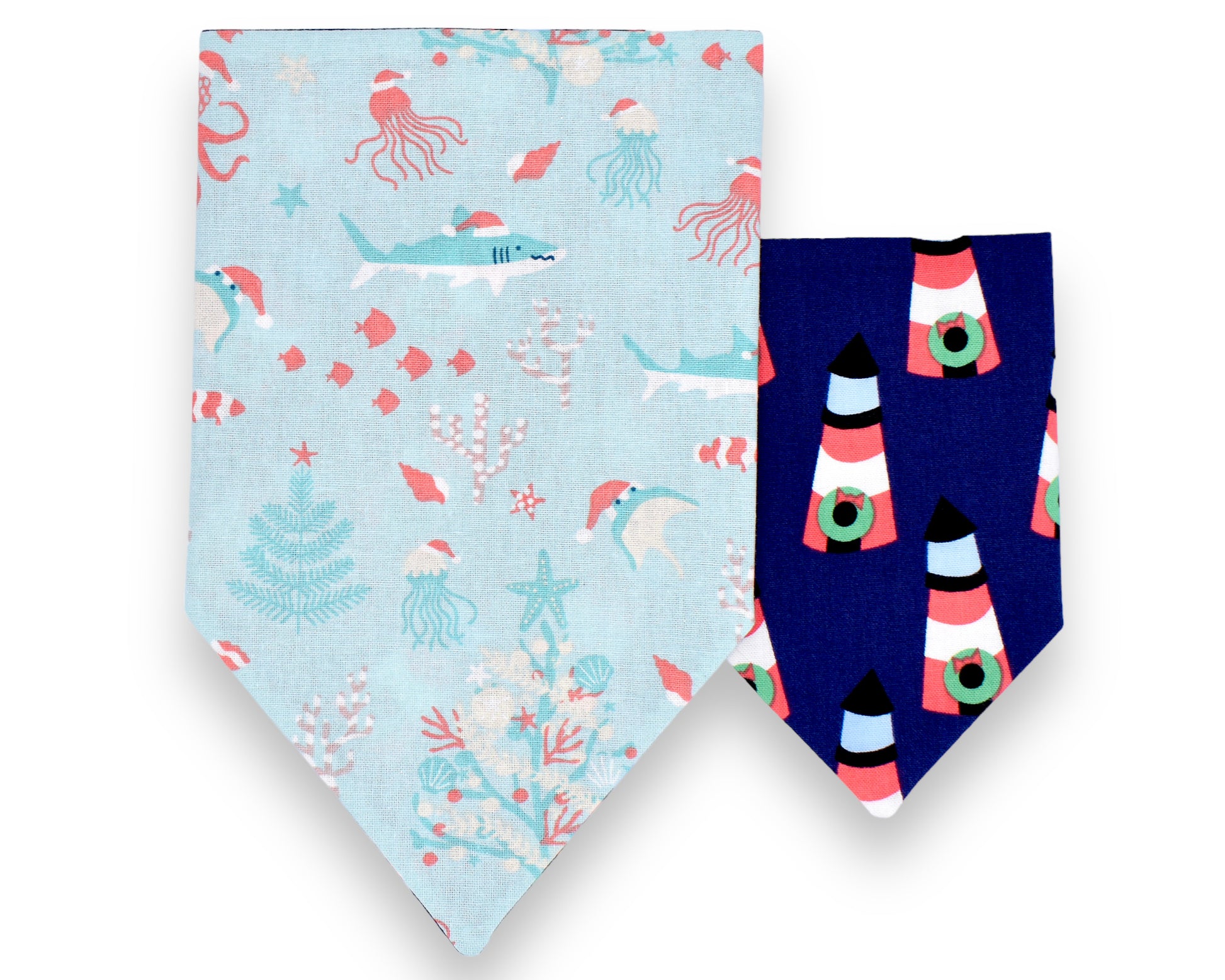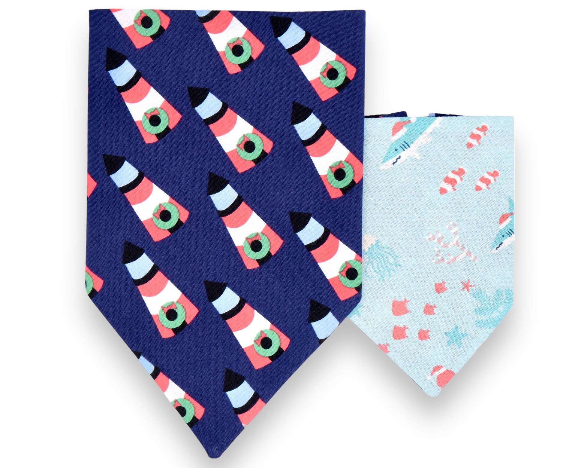 This style is dual-sided with a collar or theme-coordinated pattern on the reverse side, offering a two-for-one style option! This style can be worn by slipping your pet’s collar through the openings at the top of the bandana, and then clipping the collar around your pet’s neck. This style requires a collar for wear.
