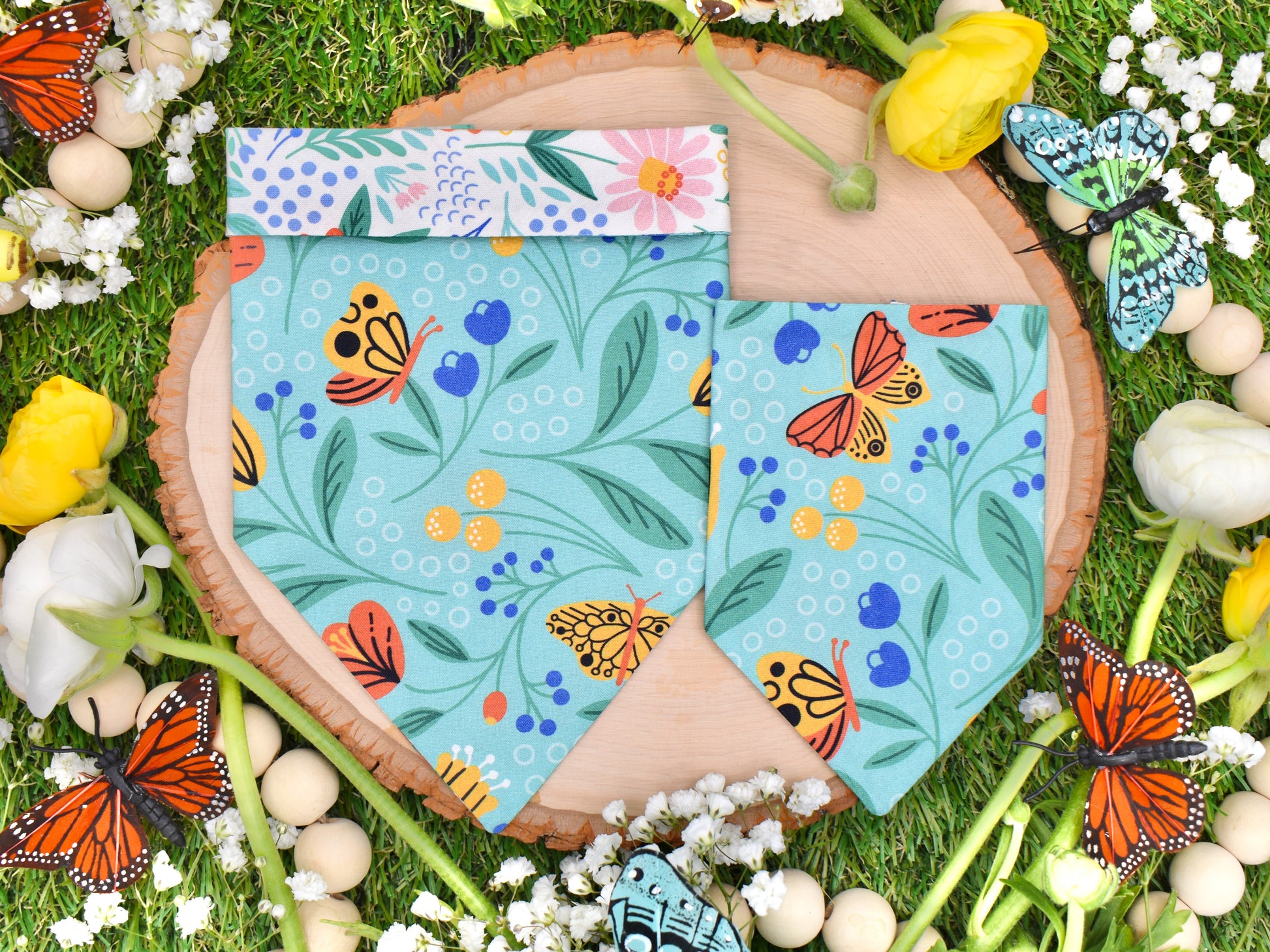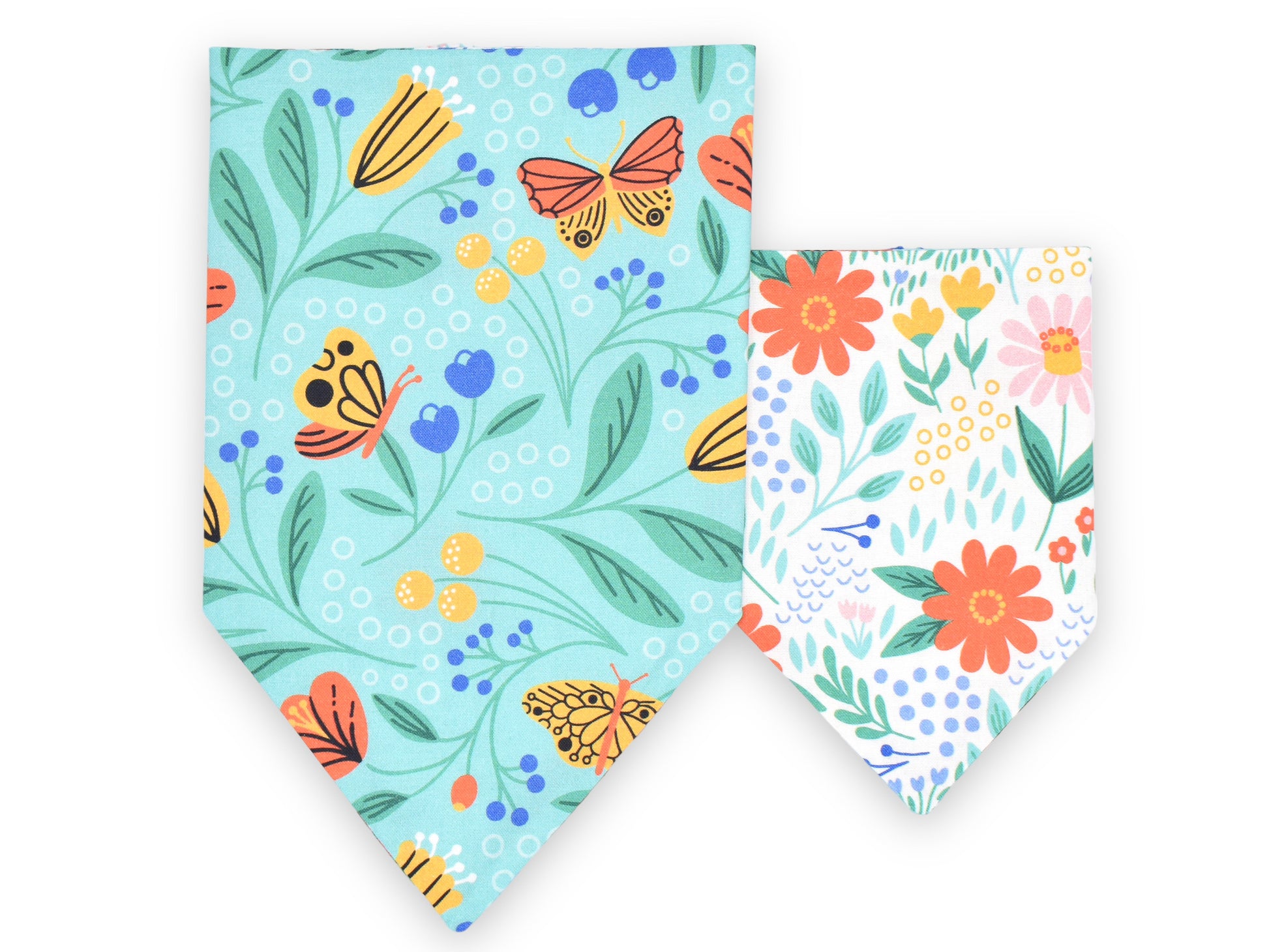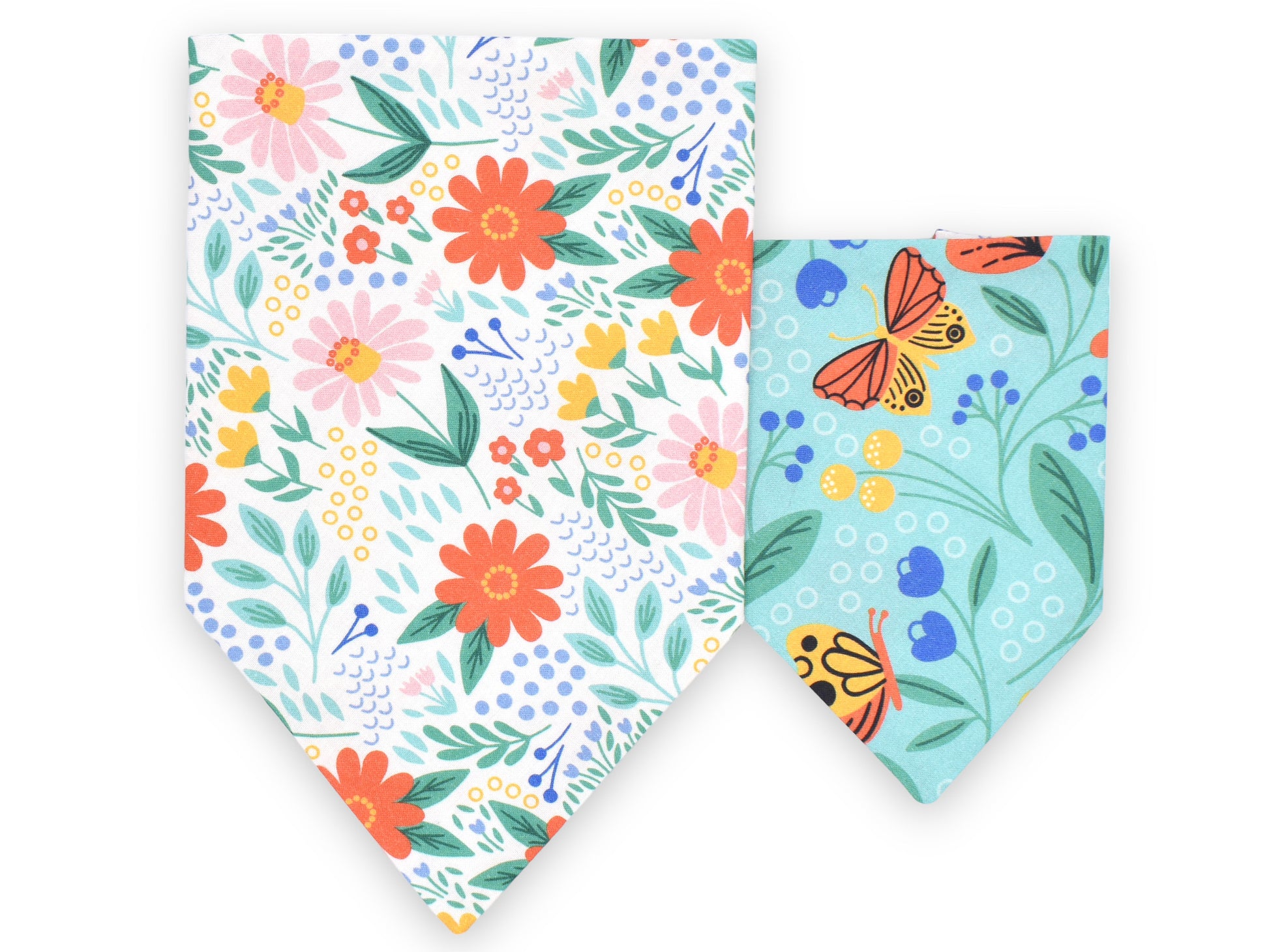 This style is dual-sided with a collar or theme-coordinated pattern on the reverse side, offering a two-for-one style option! This style can be worn by slipping your pet’s collar through the openings at the top of the bandana, and then clipping the collar around your pet’s neck. This style requires a collar for wear.