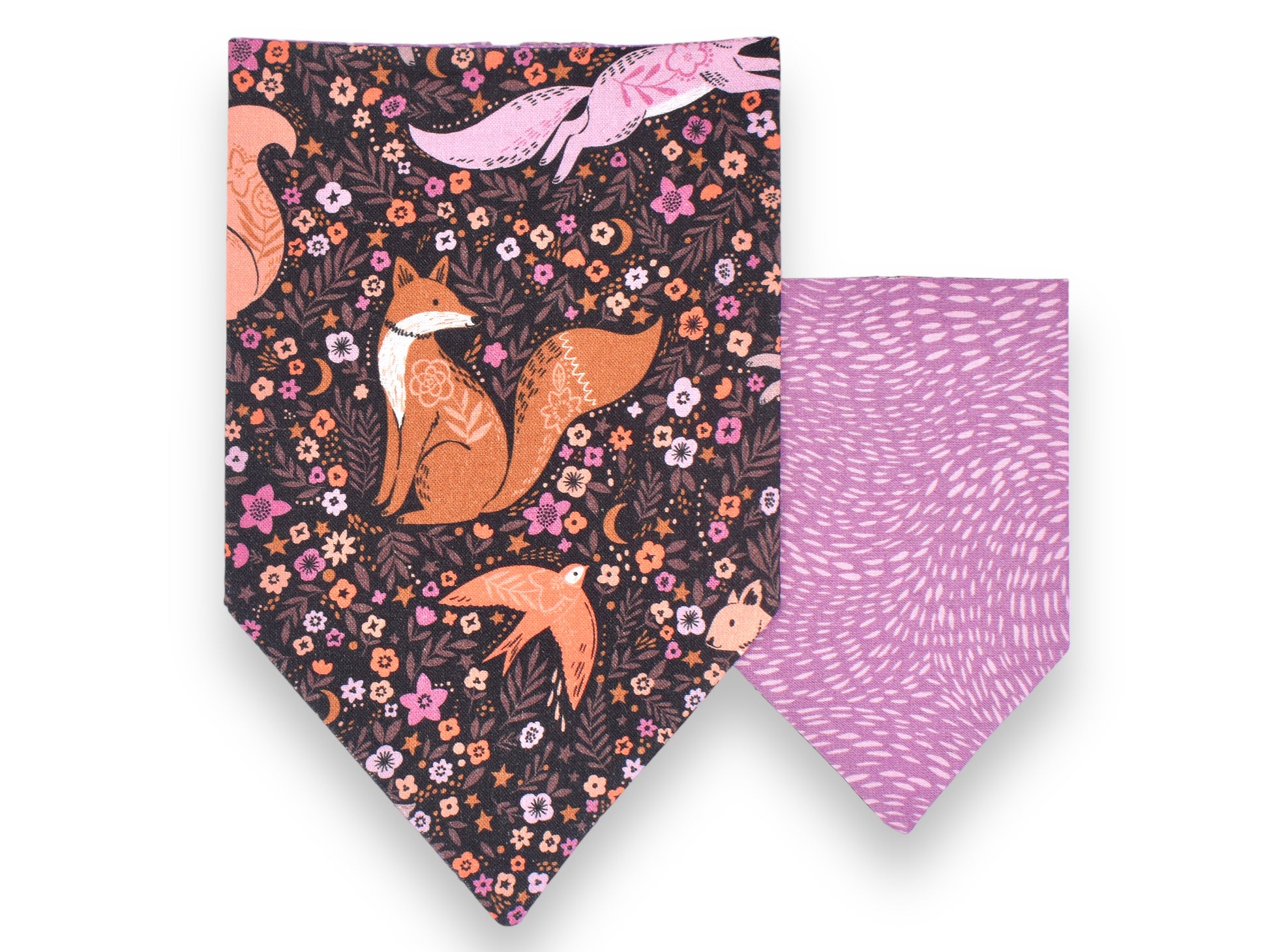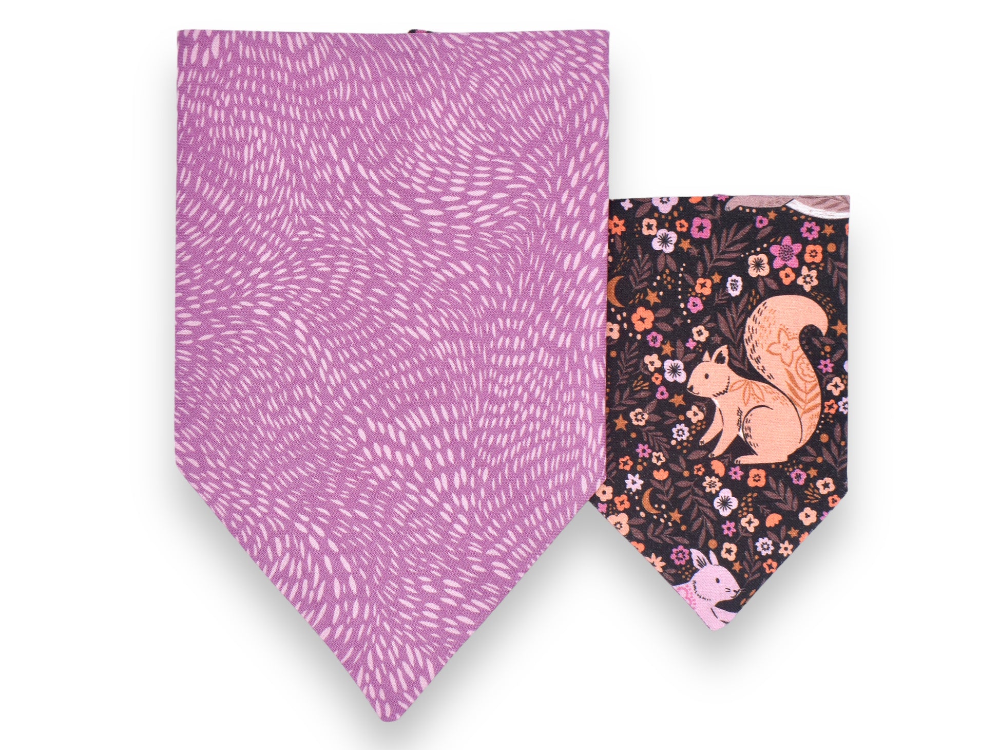 This style is dual-sided with a collar or theme-coordinated pattern on the reverse side, offering a two-for-one style option! This style can be worn by slipping your pet’s collar through the openings at the top of the bandana, and then clipping the collar around your pet’s neck. This style requires a collar for wear.