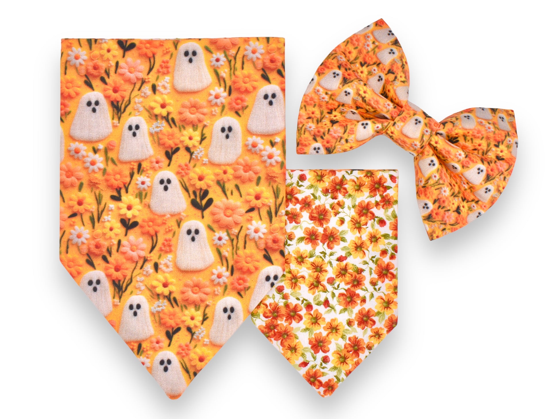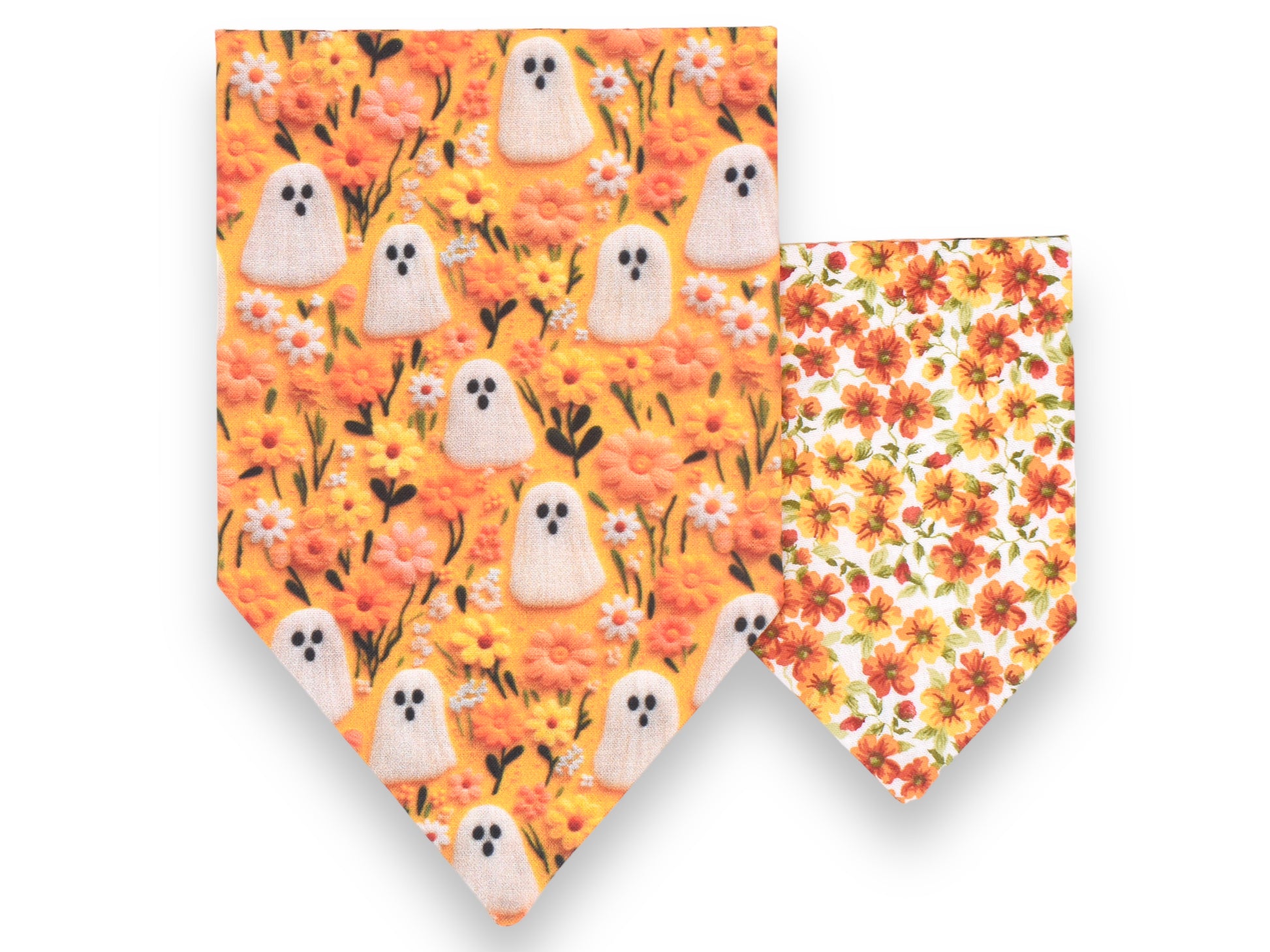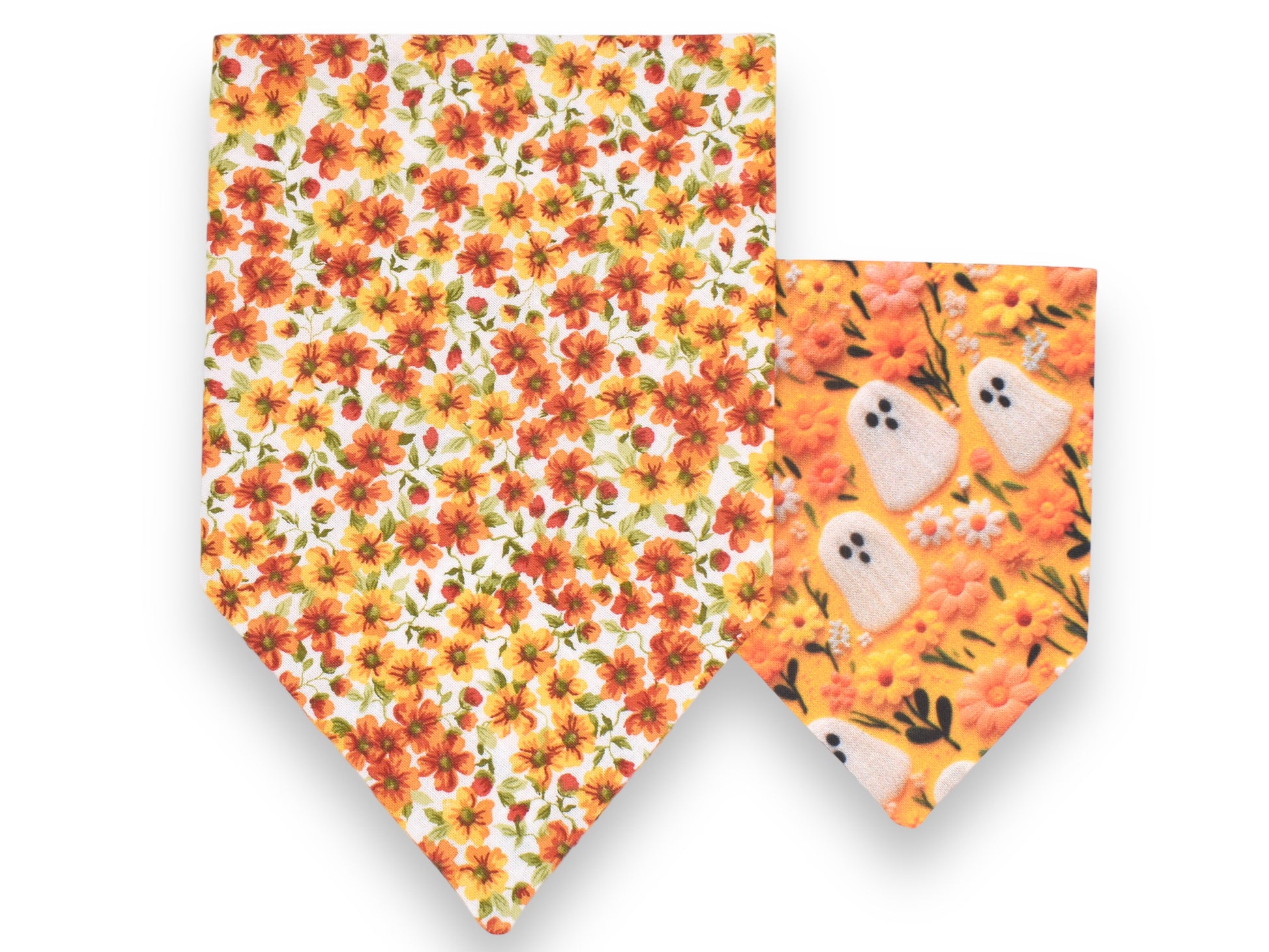 This style is dual-sided with a collar or theme-coordinated pattern on the reverse side, offering a two-for-one style option! This style can be worn by slipping your pet’s collar through the openings at the top of the bandana, and then clipping the collar around your pet’s neck. This style requires a collar for wear.