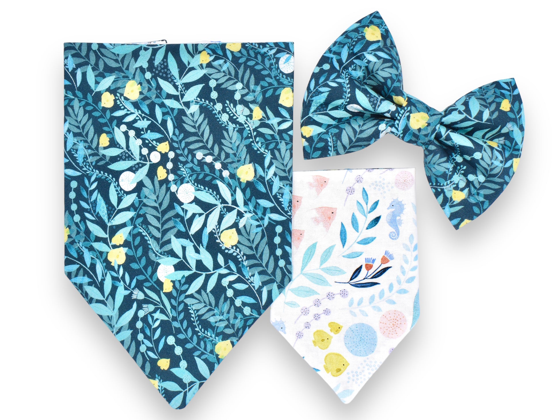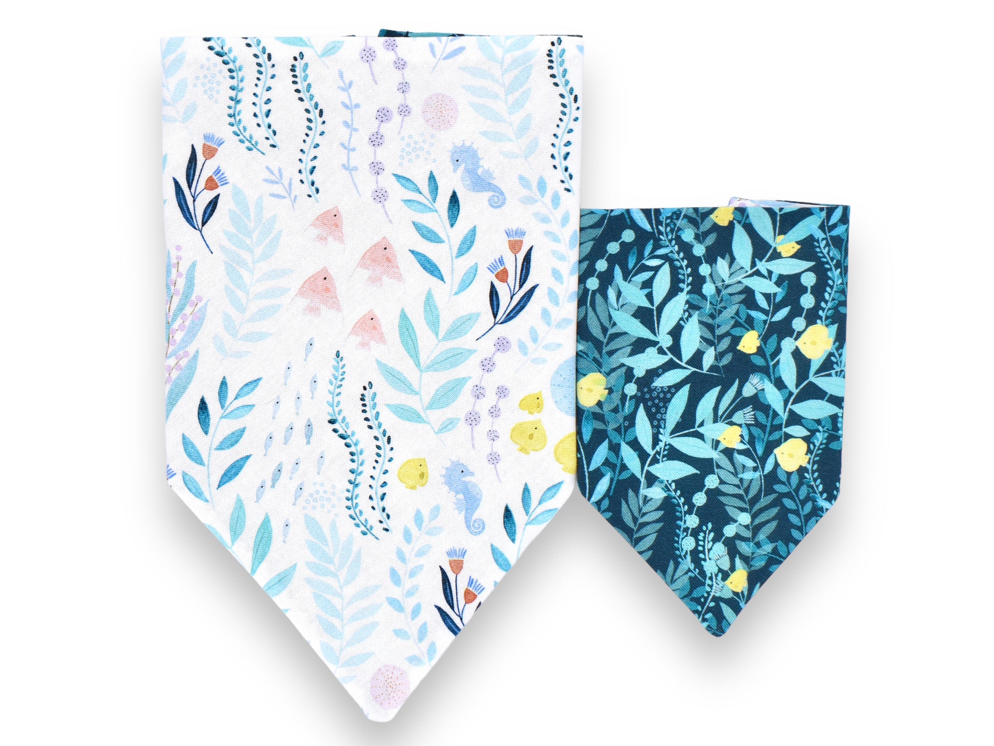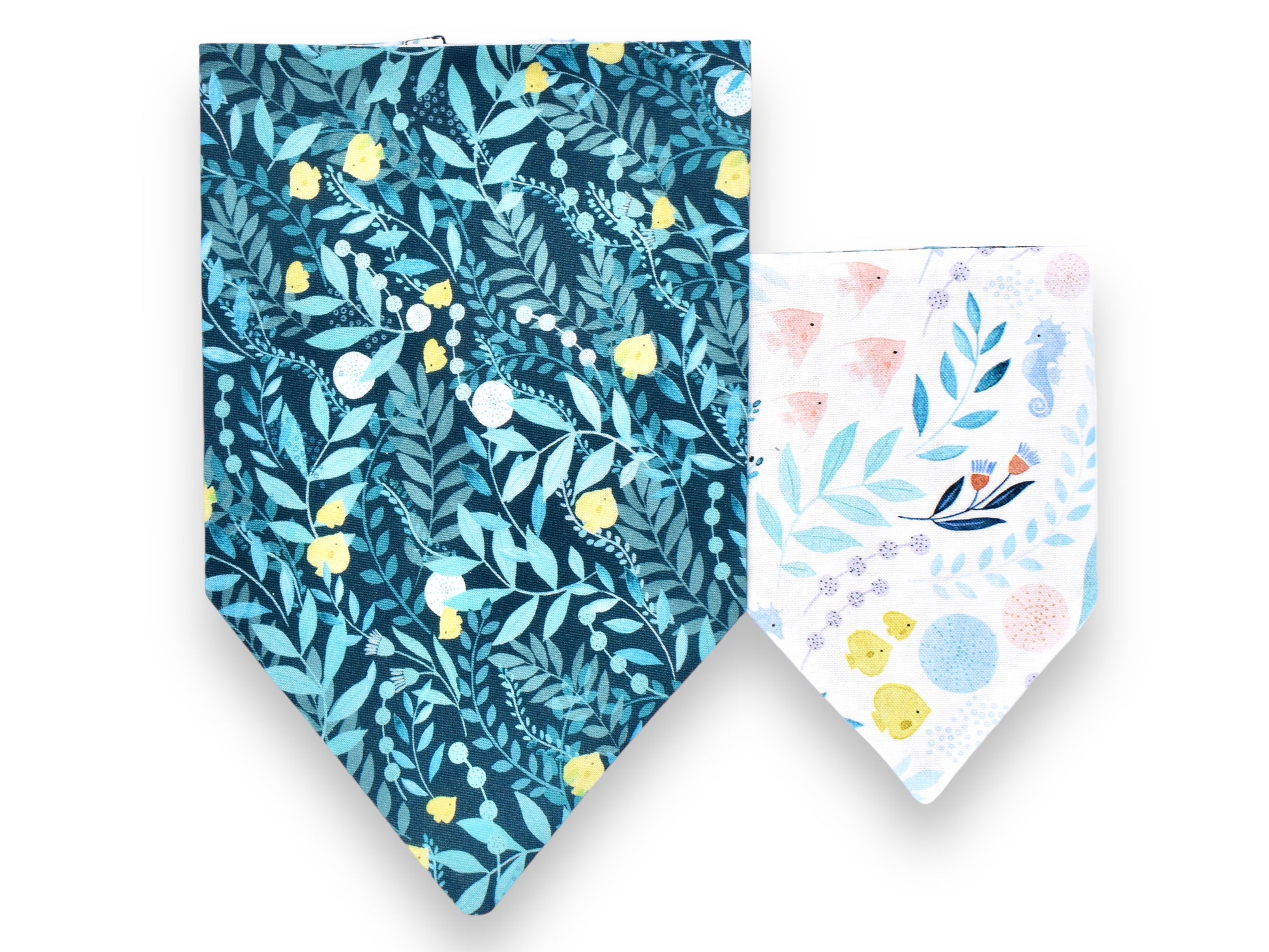 This style is dual-sided with a collar or theme-coordinated pattern on the reverse side, offering a two-for-one style option! This style can be worn by slipping your pet’s collar through the openings at the top of the bandana, and then clipping the collar around your pet’s neck. This style requires a collar for wear.