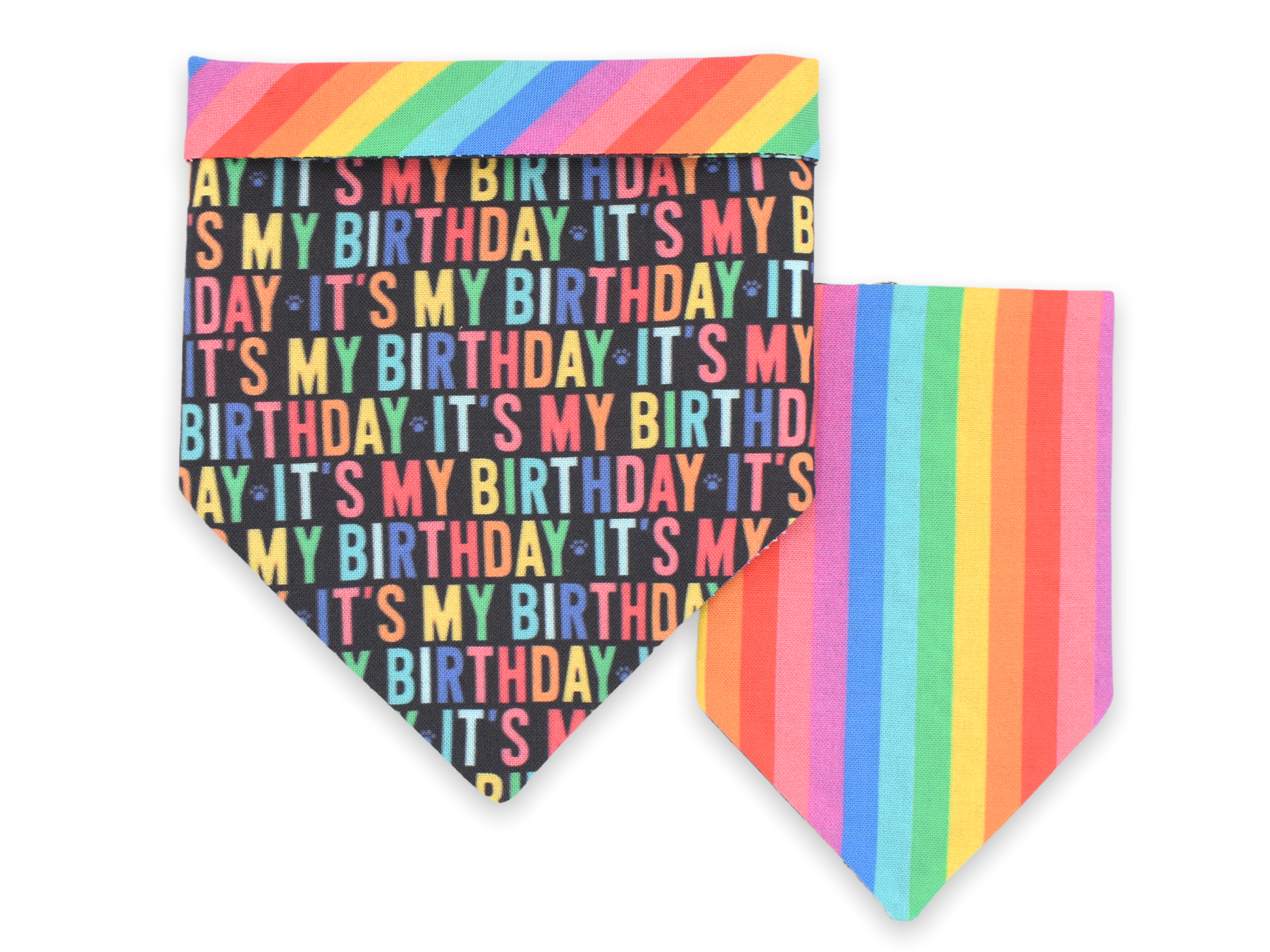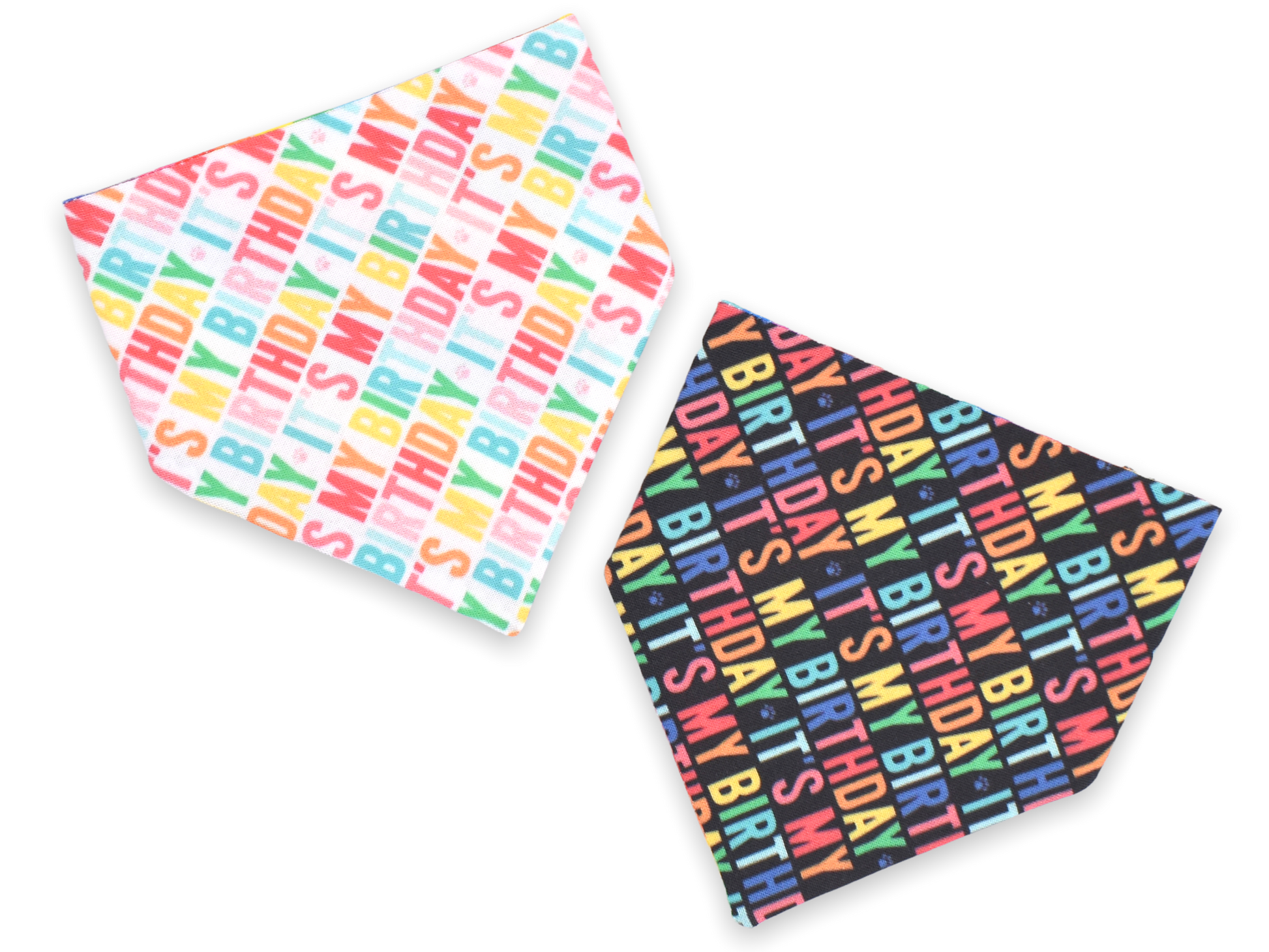 This style is dual-sided with a collar or theme-coordinated pattern on the reverse side, offering a two-for-one style option! This style can be worn by slipping your pet’s collar through the openings at the top of the bandana, and then clipping the collar around your pet’s neck. This style requires a collar for wear.