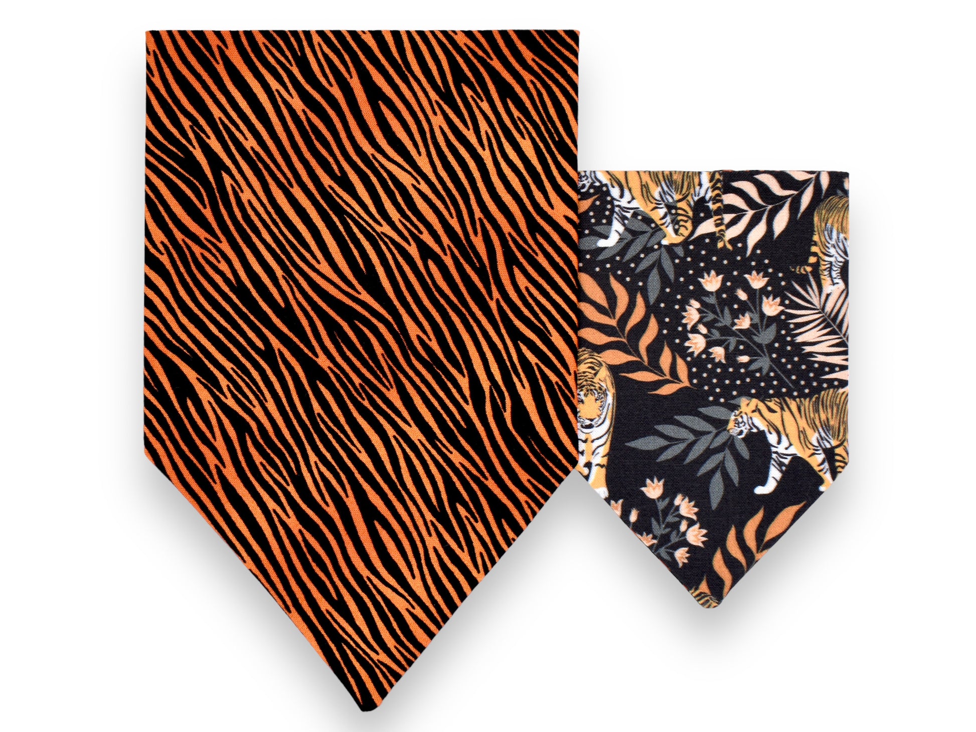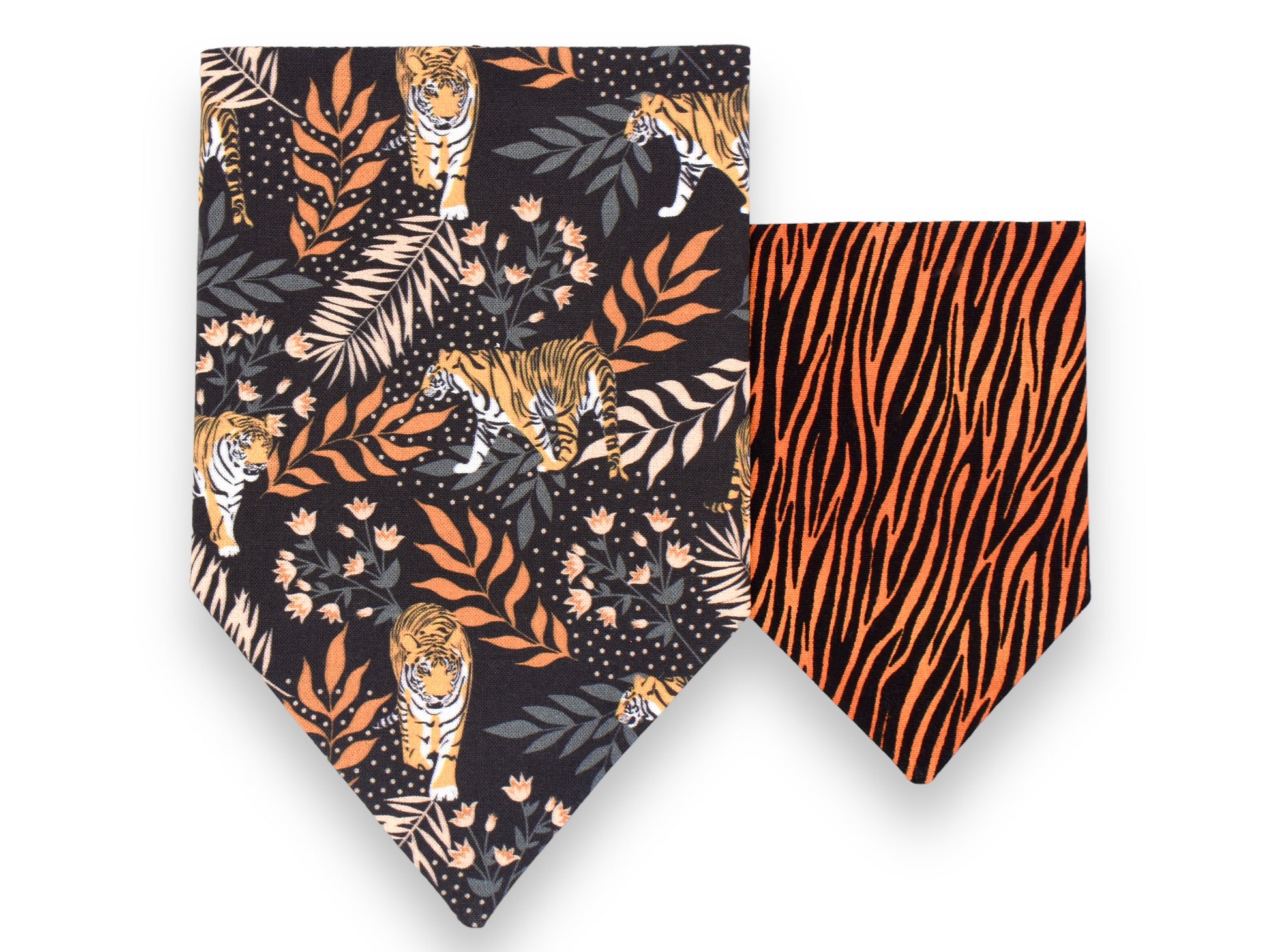 This style is dual-sided with a collar or theme-coordinated pattern on the reverse side, offering a two-for-one style option! This style can be worn by slipping your pet’s collar through the openings at the top of the bandana, and then clipping the collar around your pet’s neck. This style requires a collar for wear.