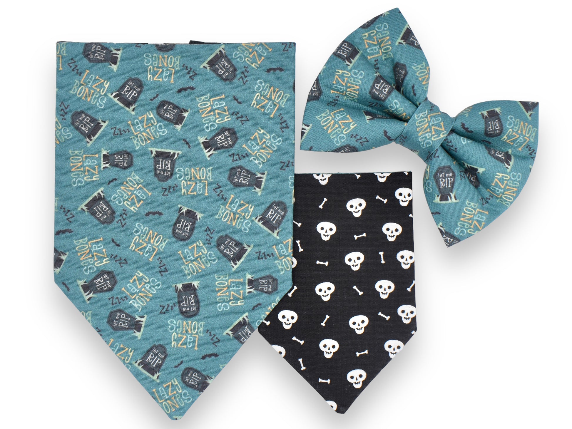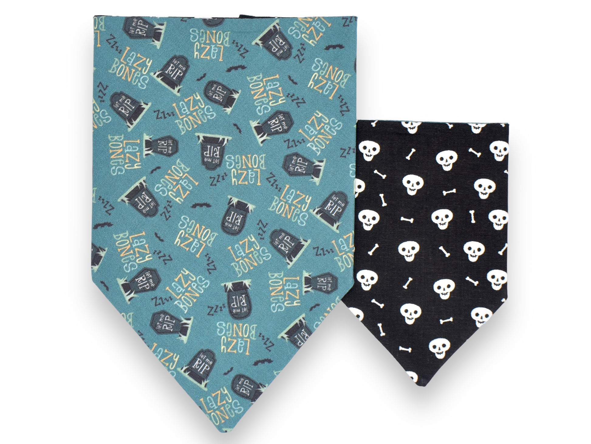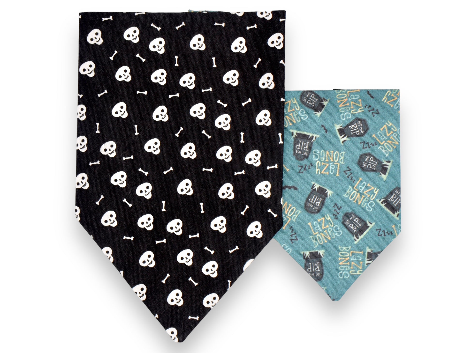 This style is dual-sided with a collar or theme-coordinated pattern on the reverse side, offering a two-for-one style option! This style can be worn by slipping your pet’s collar through the openings at the top of the bandana, and then clipping the collar around your pet’s neck. This style requires a collar for wear.