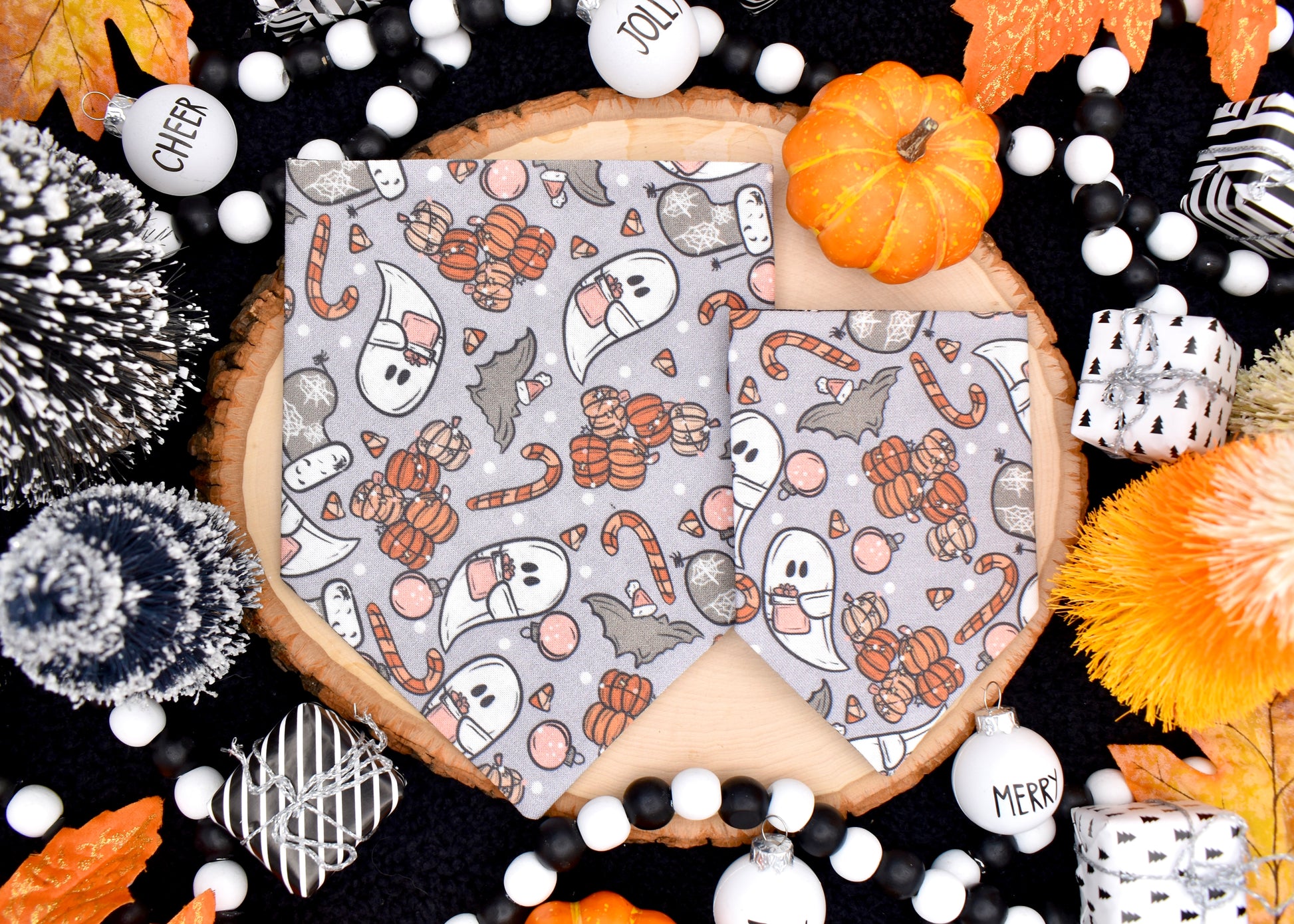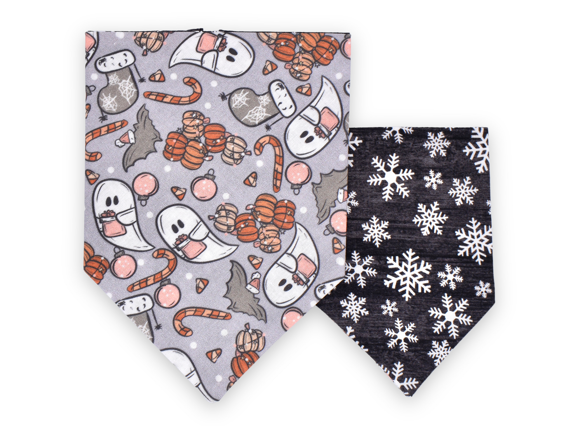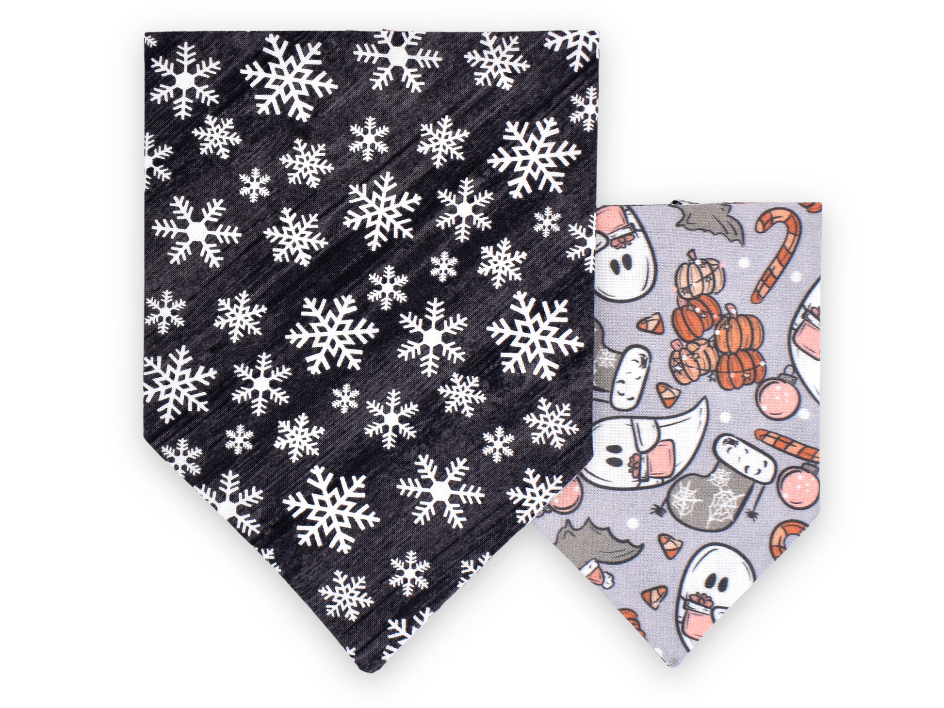 This style is dual-sided with a collar or theme-coordinated pattern on the reverse side, offering a two-for-one style option! This style can be worn by slipping your pet’s collar through the openings at the top of the bandana, and then clipping the collar around your pet’s neck. This style requires a collar for wear.