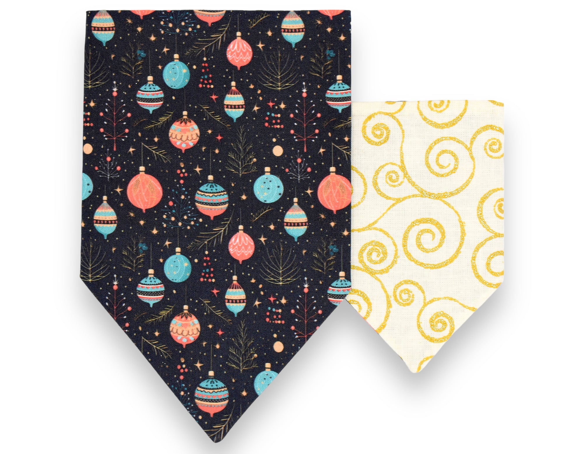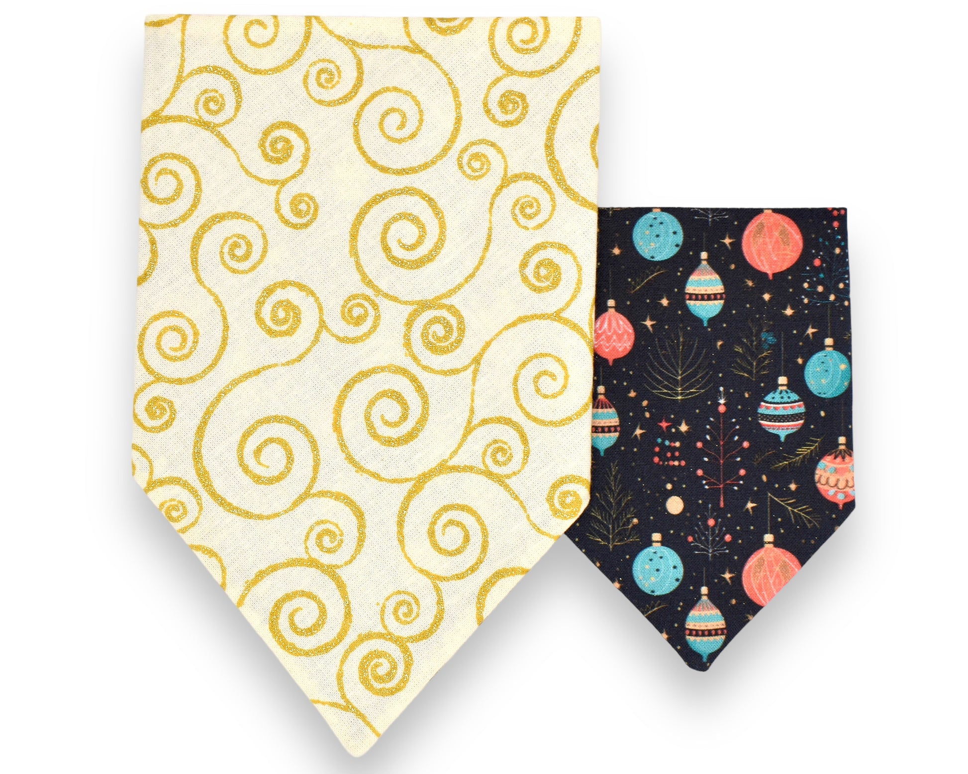 This style is dual-sided with a collar or theme-coordinated pattern on the reverse side, offering a two-for-one style option! This style can be worn by slipping your pet’s collar through the openings at the top of the bandana, and then clipping the collar around your pet’s neck. This style requires a collar for wear.