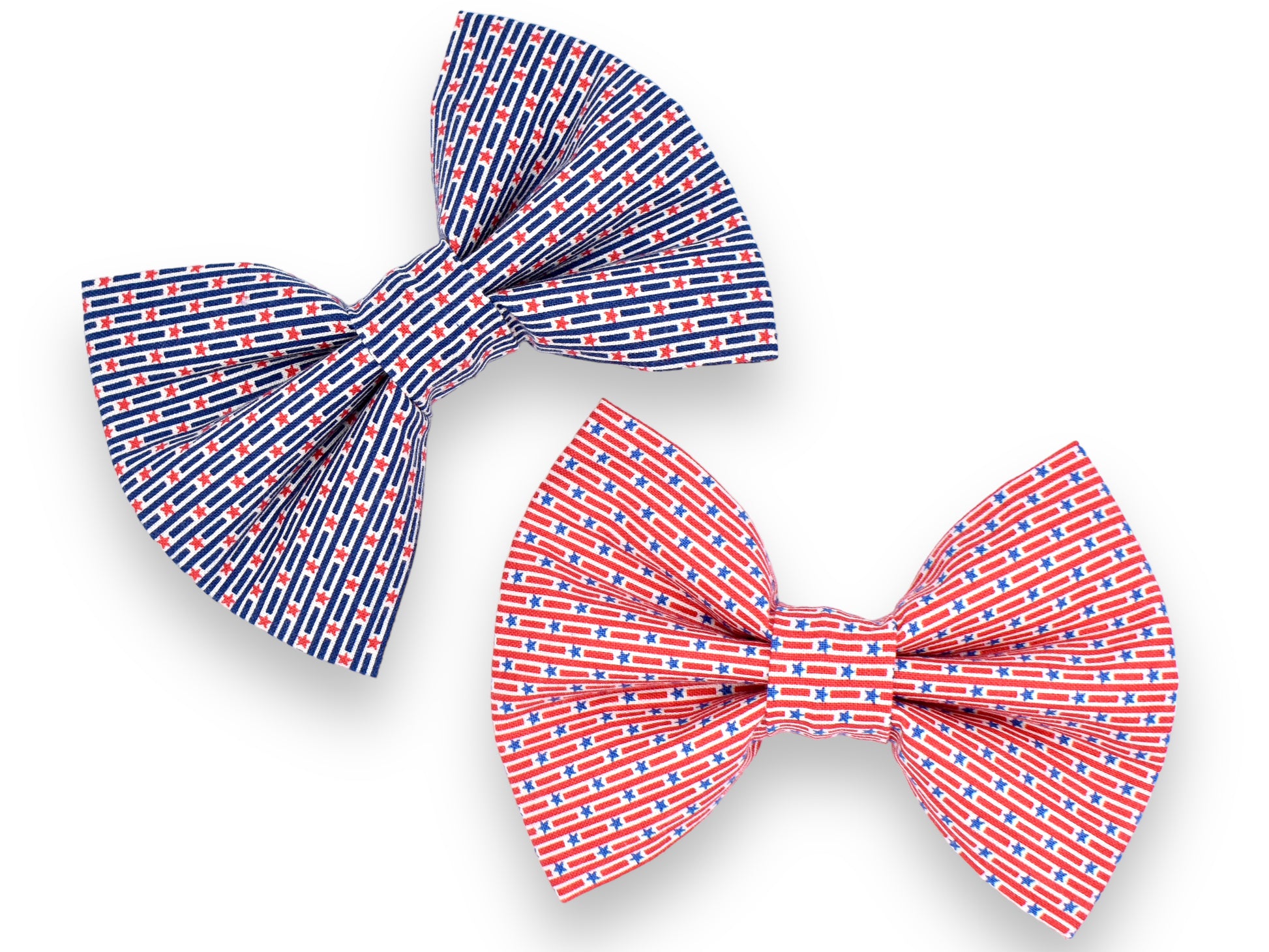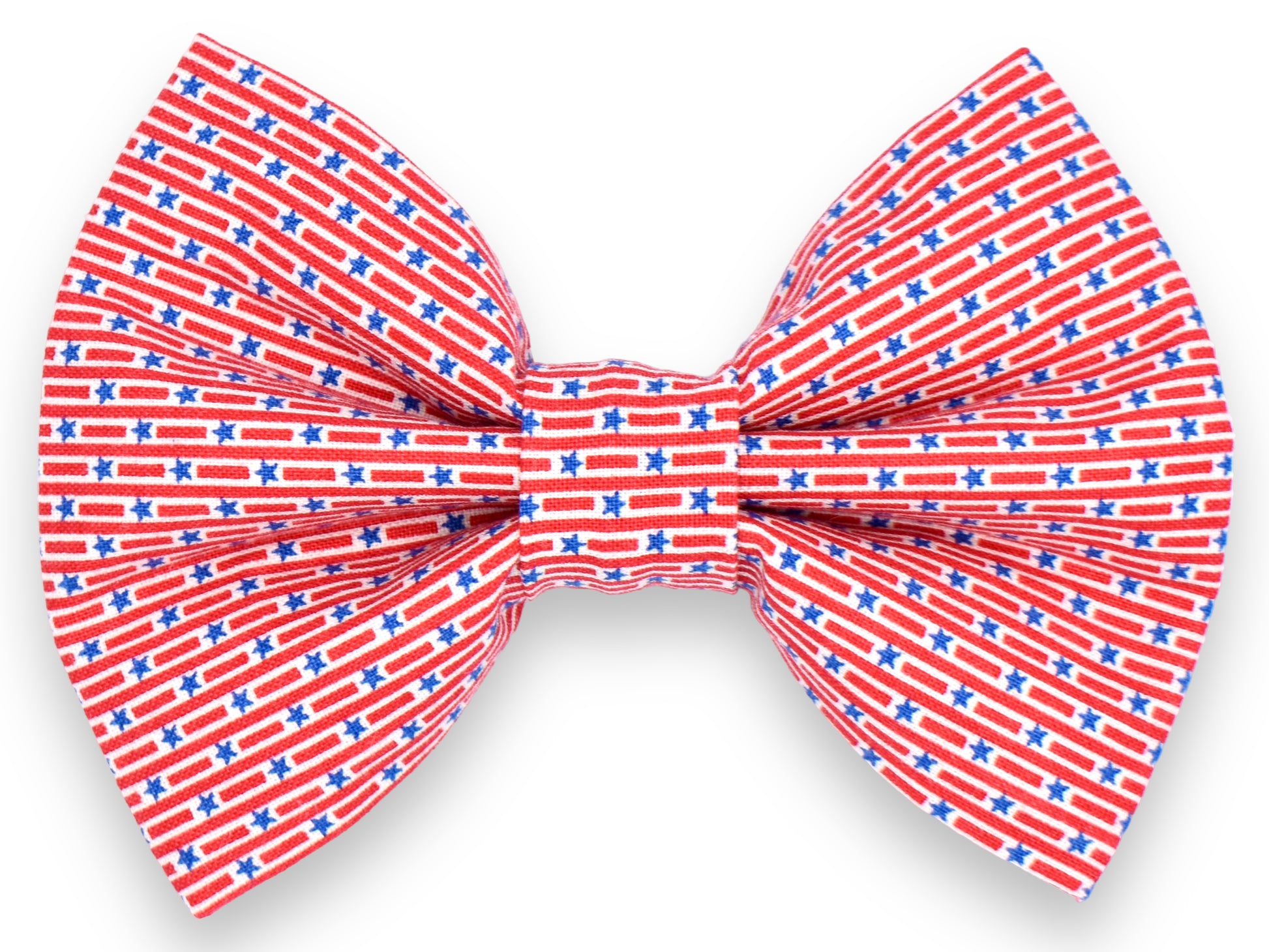 Our original style bow tie! This style features two elastic straps stitched to the backside of the bow tie for your pet’s collar to slide through. The elastic straps are triple-stitched to the bow tie for extra security. This style requires a collar for wear.