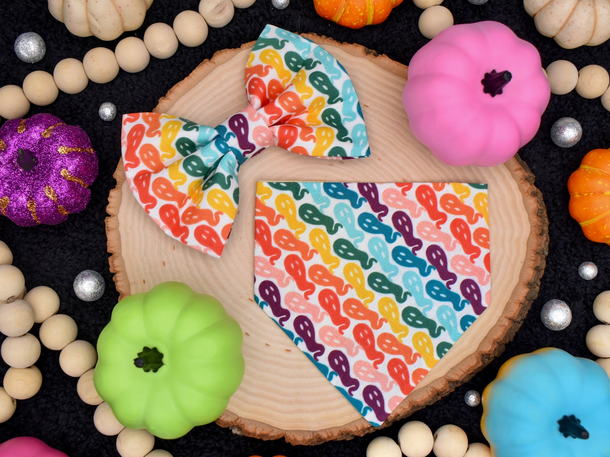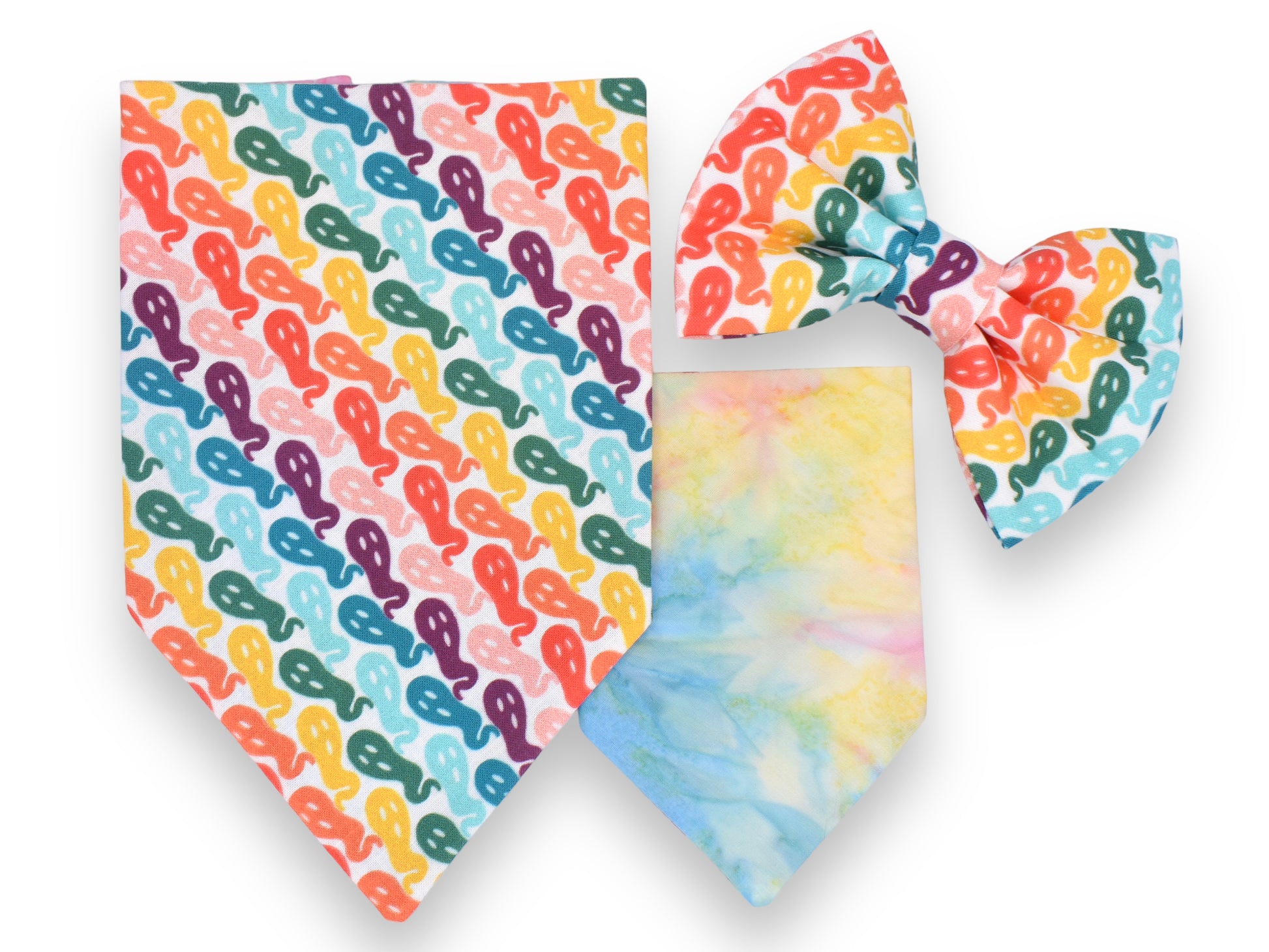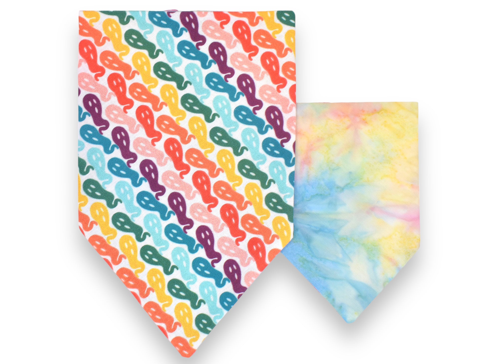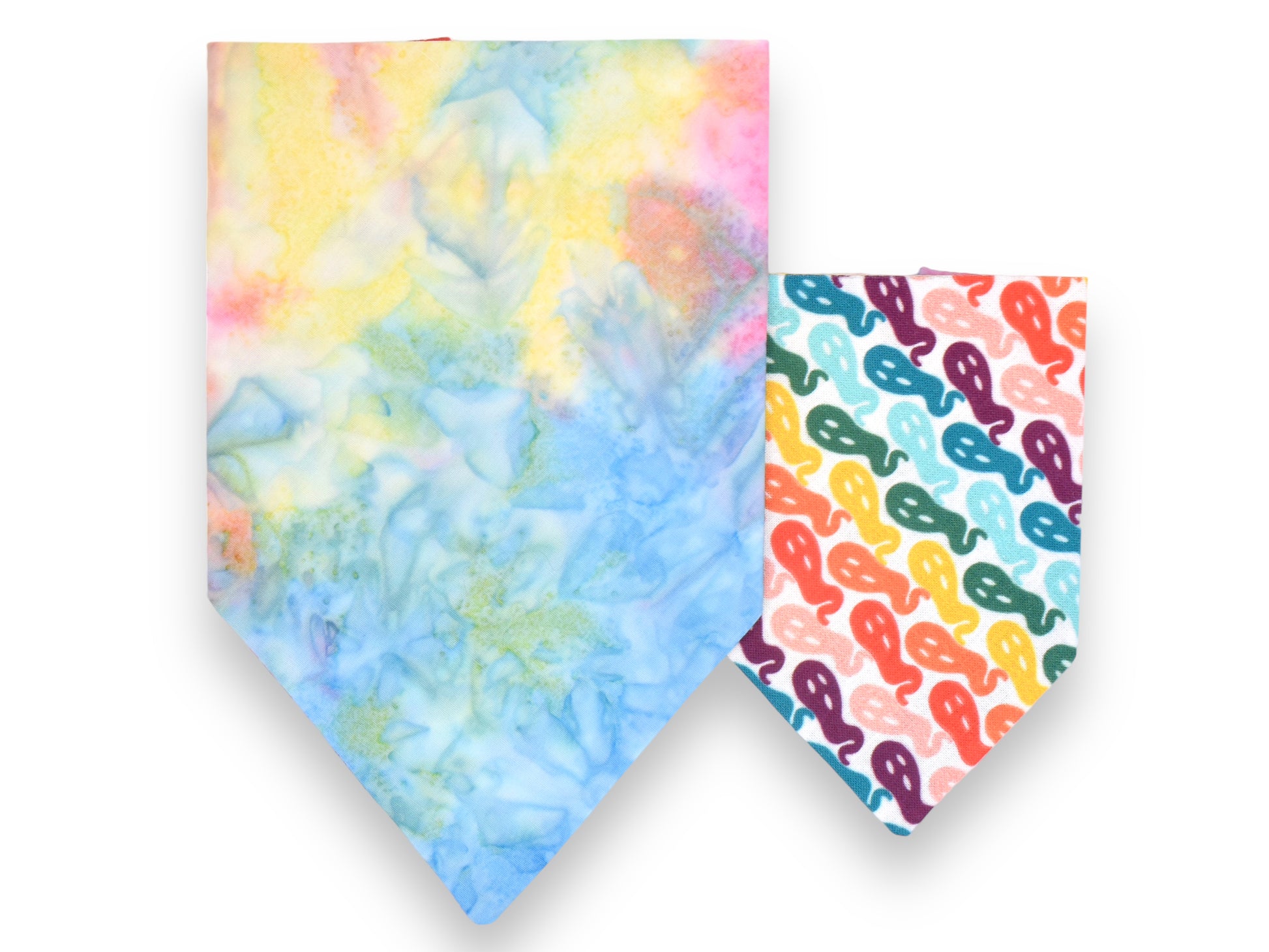 This style is dual-sided with a collar or theme-coordinated pattern on the reverse side, offering a two-for-one style option! This style can be worn by slipping your pet’s collar through the openings at the top of the bandana, and then clipping the collar around your pet’s neck. This style requires a collar for wear.
