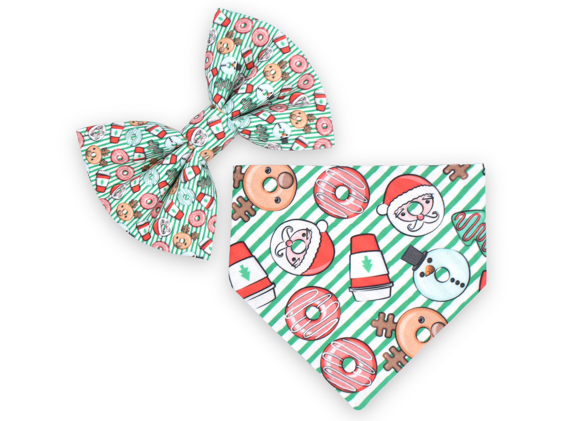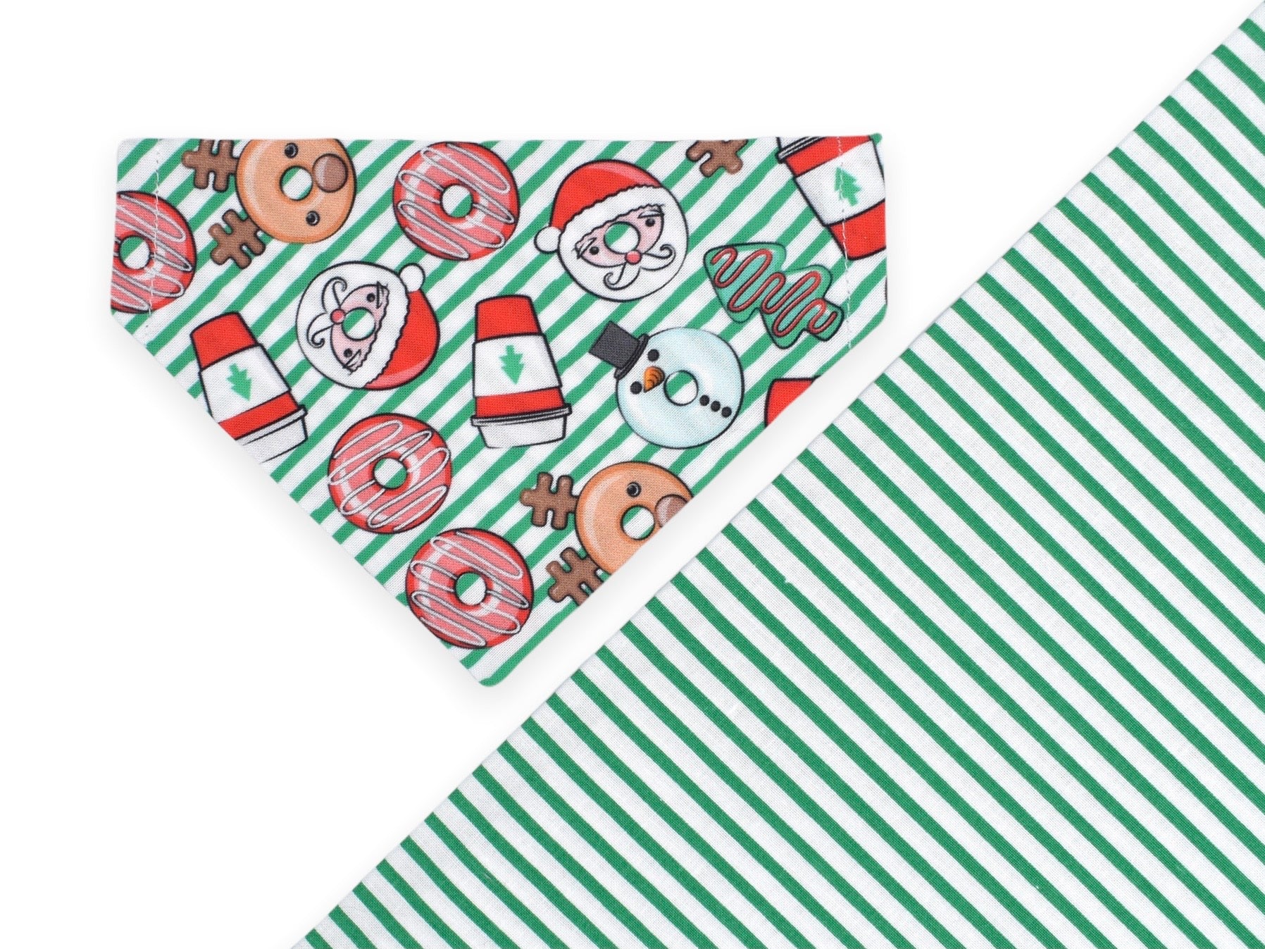 This style is dual-sided with a collar or theme-coordinated pattern on the reverse side, offering a two-for-one style option! This style can be worn by slipping your pet’s collar through the openings at the top of the bandana, and then clipping the collar around your pet’s neck. This style requires a collar for wear.