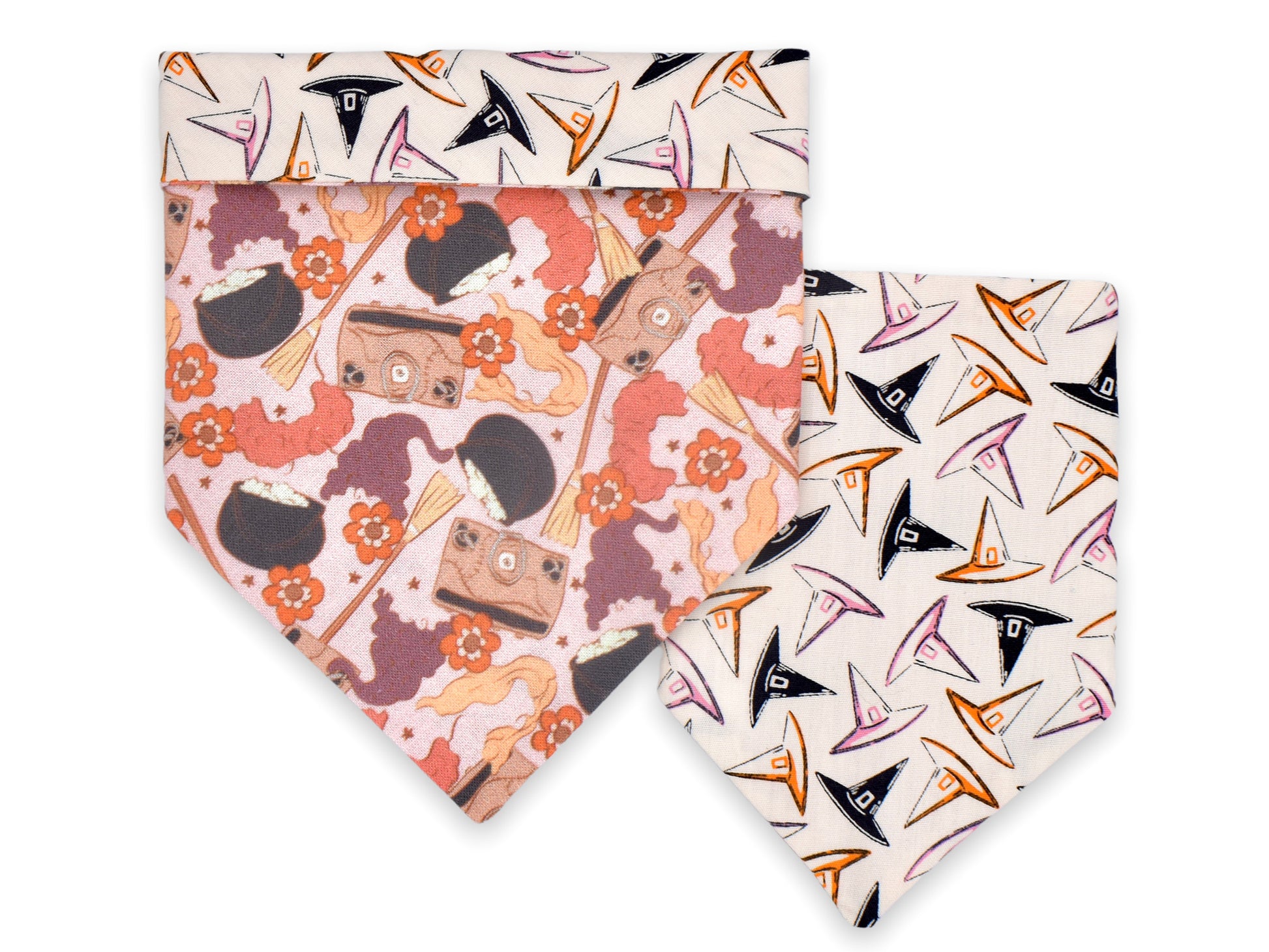 This style is dual-sided with a collar or theme-coordinated pattern on the reverse side, offering a two-for-one style option! This style can be worn by slipping your pet’s collar through the openings at the top of the bandana, and then clipping the collar around your pet’s neck. This style requires a collar for wear.