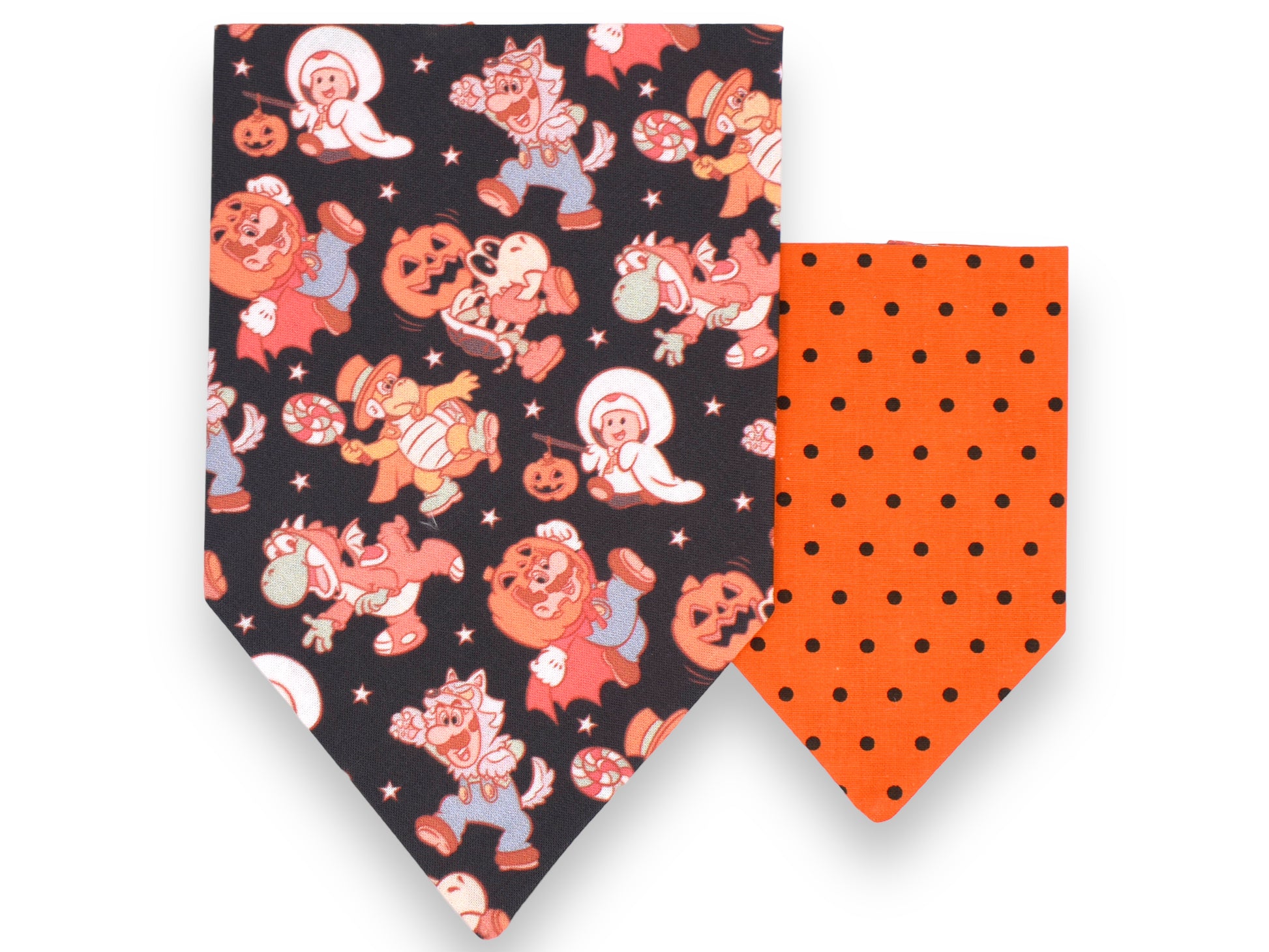 This style is dual-sided with a collar or theme-coordinated pattern on the reverse side, offering a two-for-one style option! This style can be worn by slipping your pet’s collar through the openings at the top of the bandana, and then clipping the collar around your pet’s neck. This style requires a collar for wear.