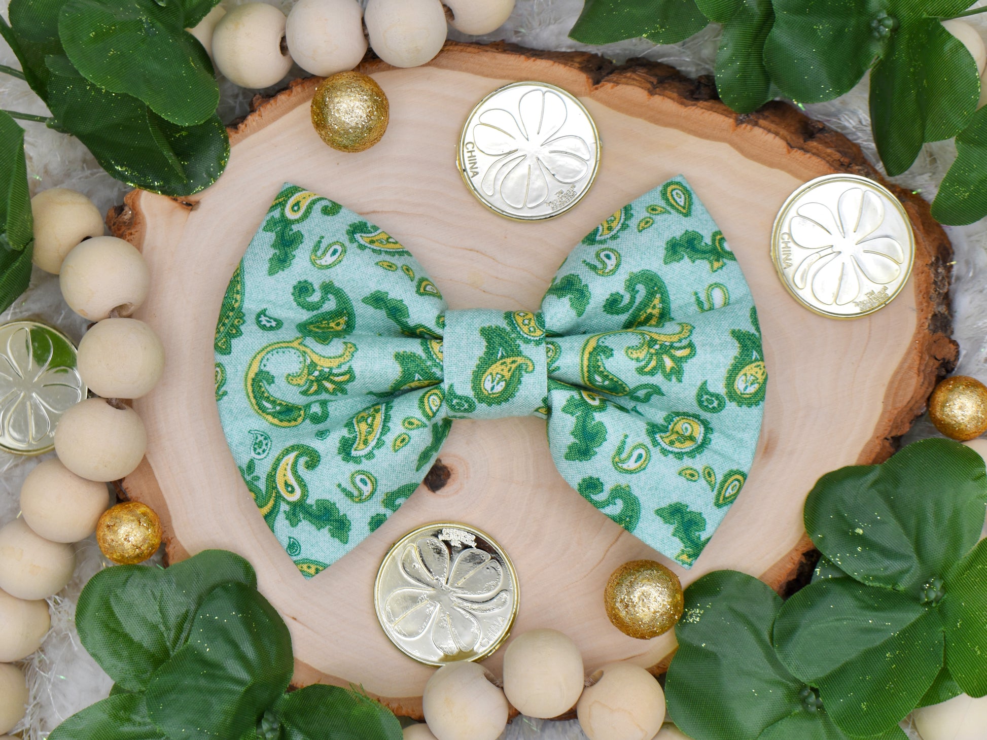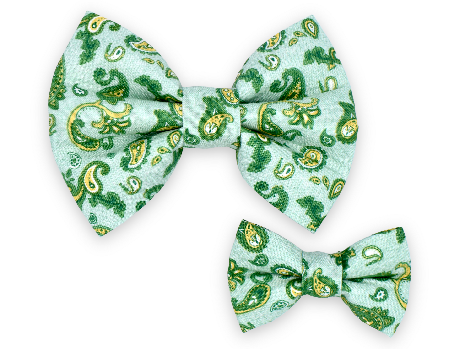 Accessories are not intended for rough wear. Bow ties with elastic collars and scrunchie-style bandanas completely circle your pet’s neck and are not made with a breakaway function. We do not recommend leaving your pet unsupervised while wearing any accessory. Spot clean mild detergent and lay flat to dry. If ironing, cover with thin cloth and use low heat and pressure.