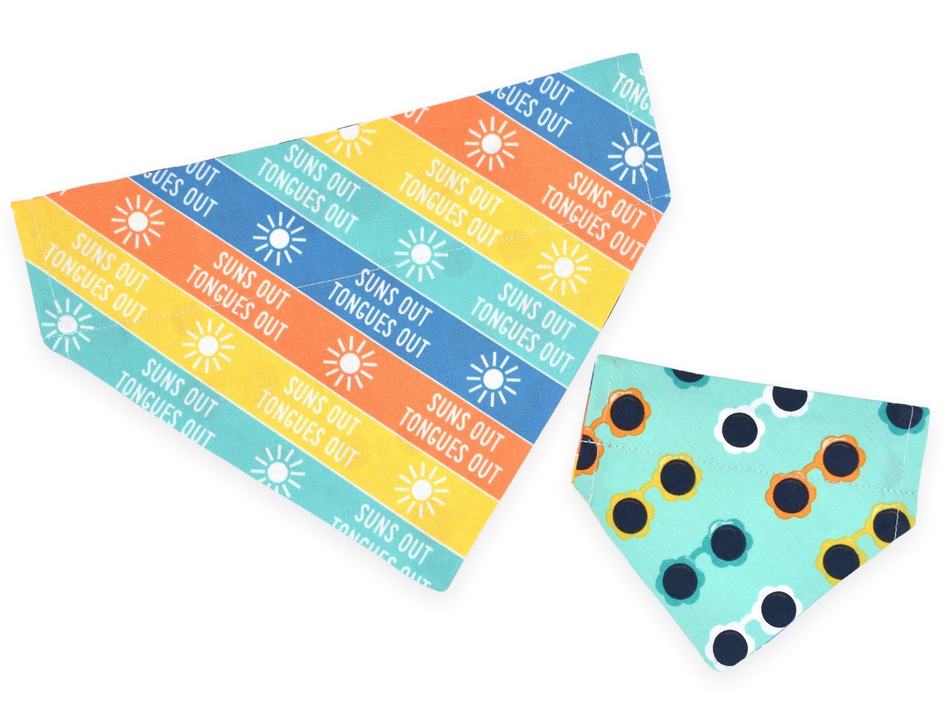 This style is dual-sided with a collar or theme-coordinated pattern on the reverse side, offering a two-for-one style option! This style can be worn by slipping your pet’s collar through the openings at the top of the bandana, and then clipping the collar around your pet’s neck. This style requires a collar for wear.
