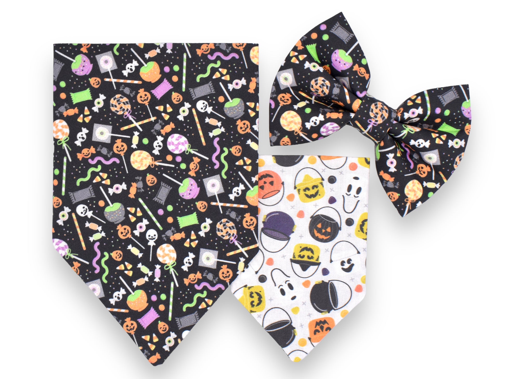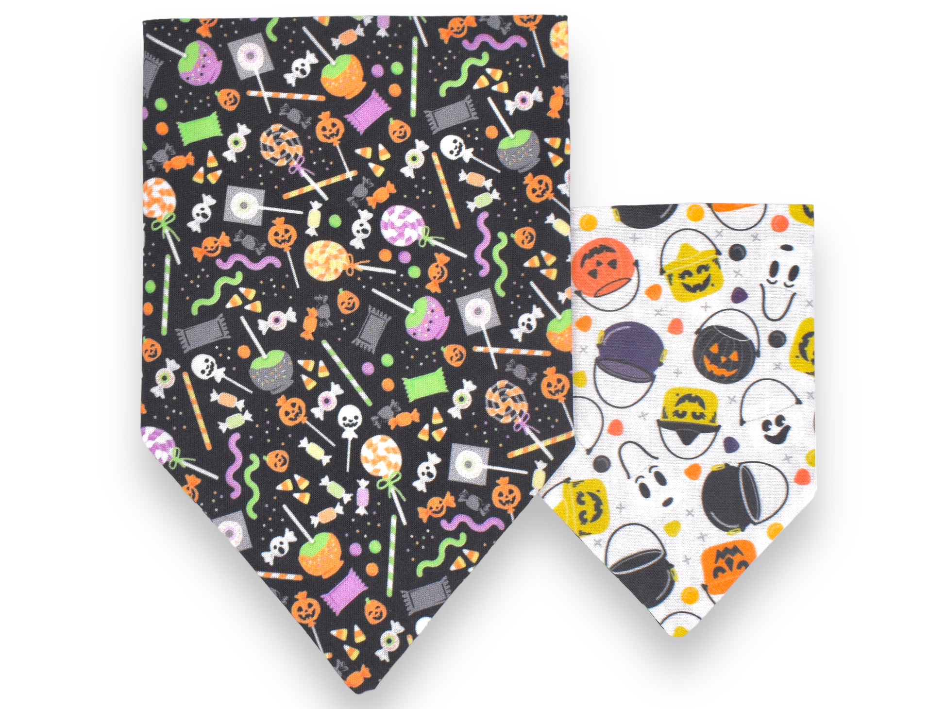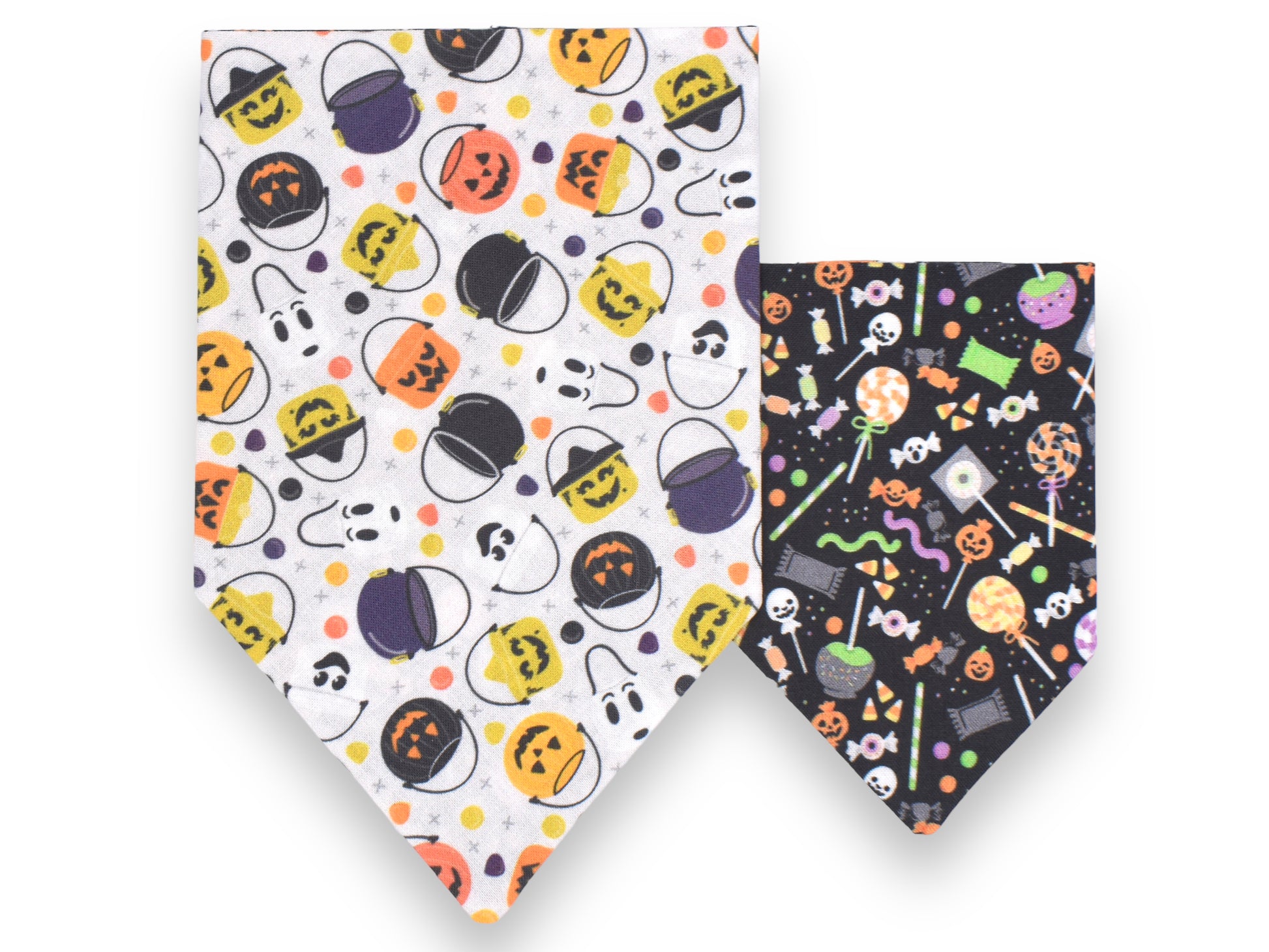 This style is dual-sided with a collar or theme-coordinated pattern on the reverse side, offering a two-for-one style option! This style can be worn by slipping your pet’s collar through the openings at the top of the bandana, and then clipping the collar around your pet’s neck. This style requires a collar for wear.