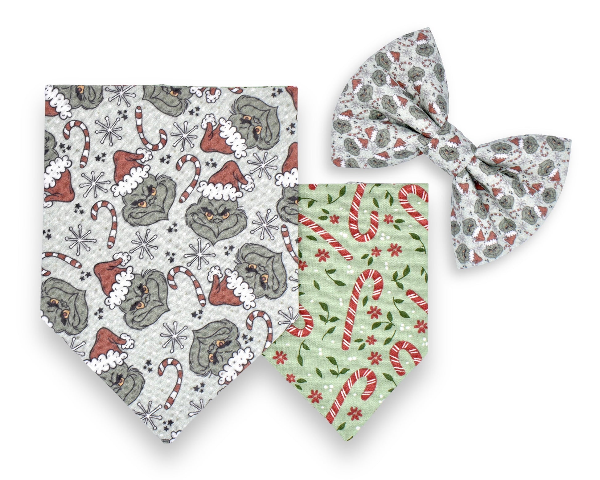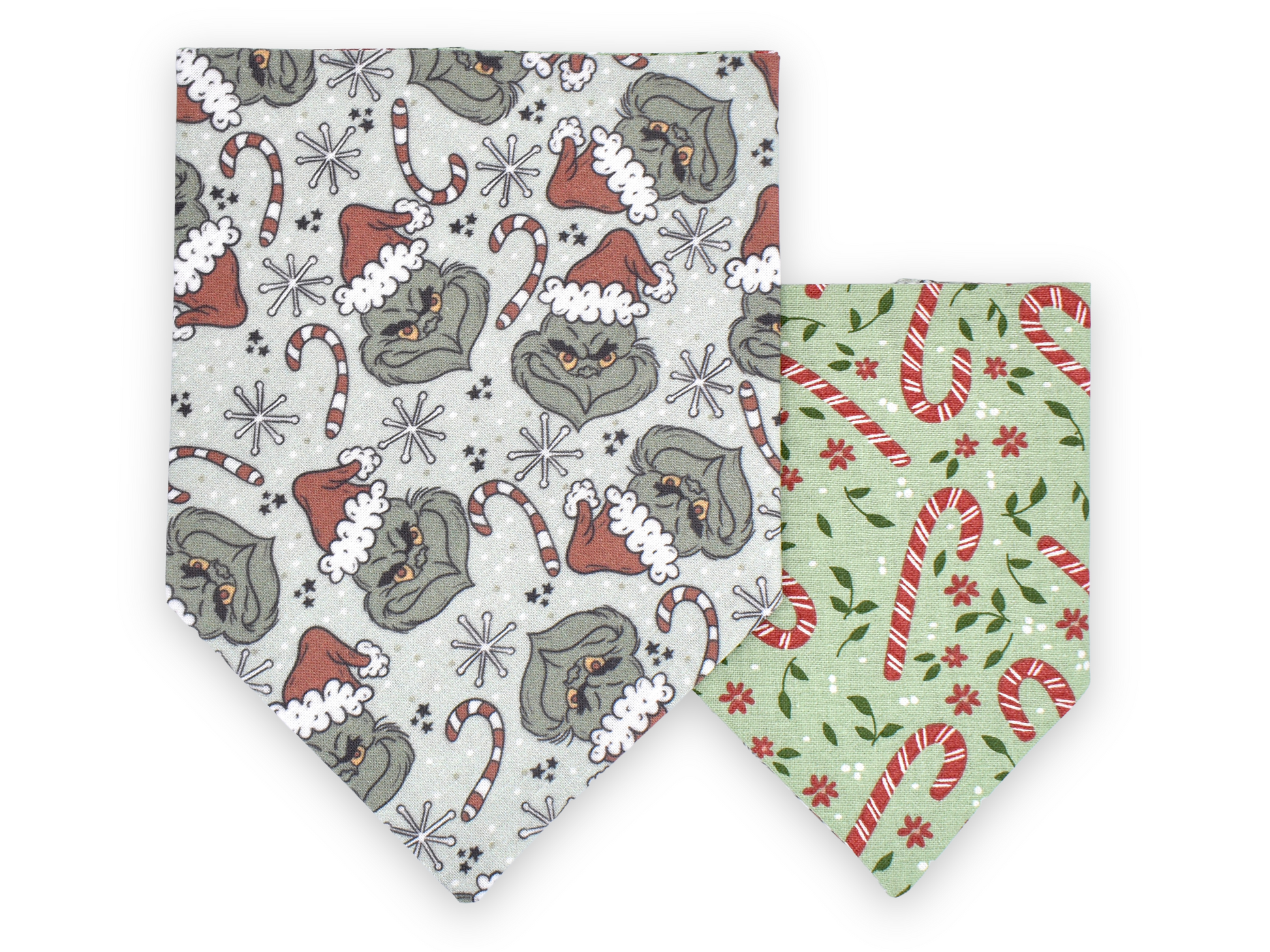 This style is dual-sided with a collar or theme-coordinated pattern on the reverse side, offering a two-for-one style option! This style can be worn by slipping your pet’s collar through the openings at the top of the bandana, and then clipping the collar around your pet’s neck. This style requires a collar for wear.